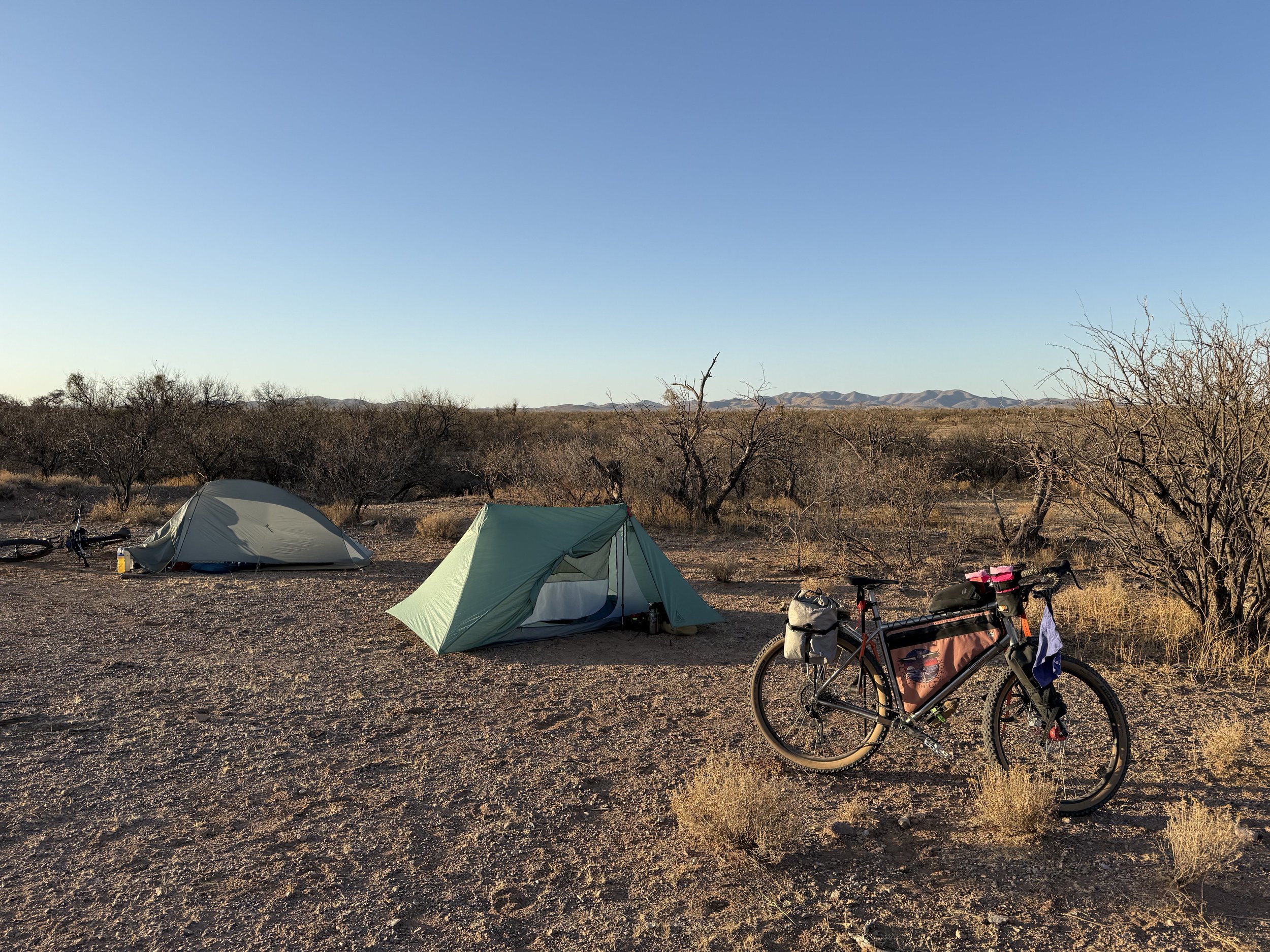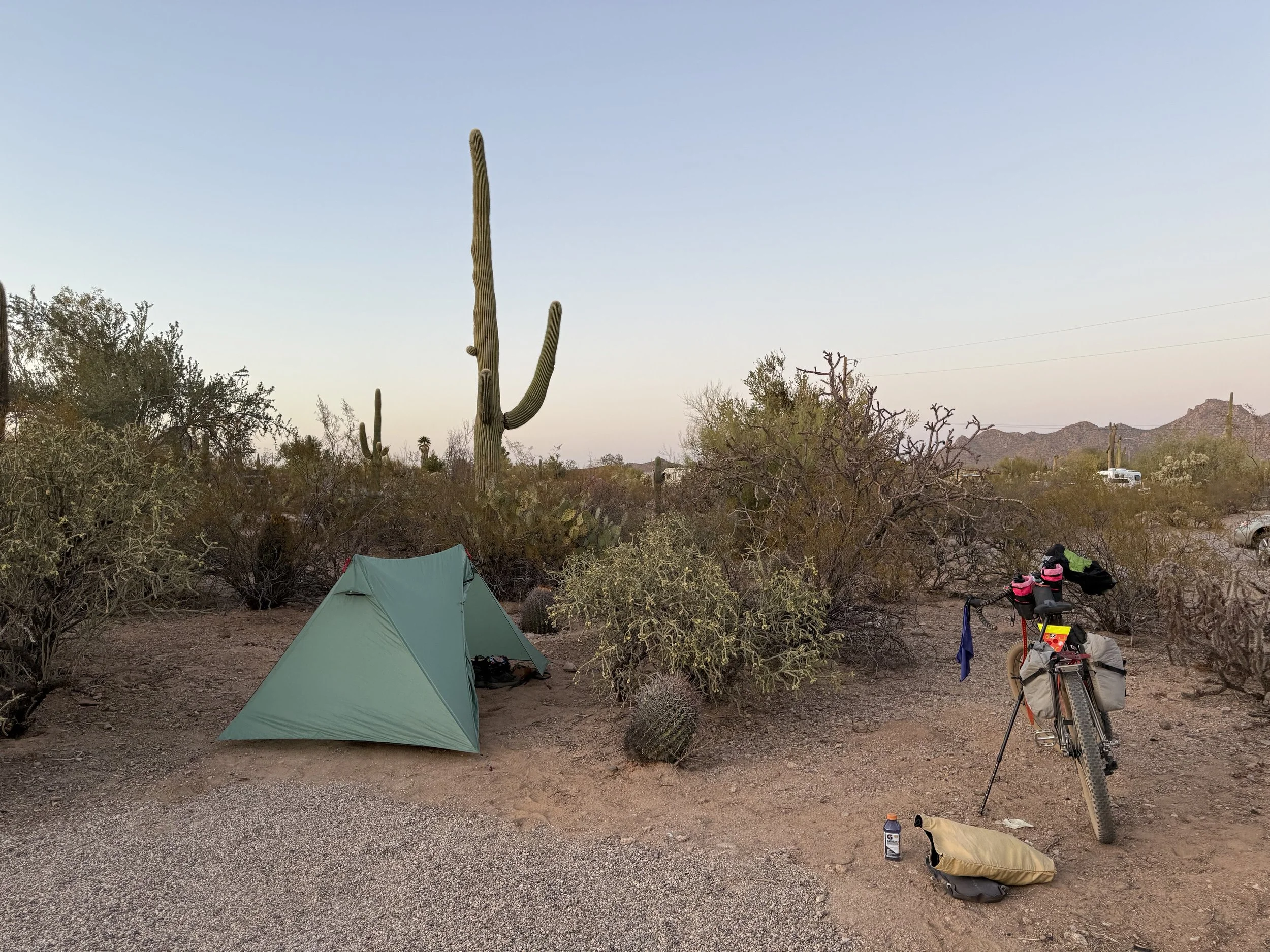 But as I was walking back to my campsite, the neighbor one spot over called out to me. Mike, it turned out, watched me roll in on my bikepacking rig and sat in curiosity while I went about my afternoon chores. We got to talking, him peppering me with questions about the SAUER, what bikepacking was, and my ride tomorrow. The conclusion to all this was an invitation by him to cook my dinner. I declined not wanting to intrude, but he insisted he wanted to hear more about bikepacking and the area as he hailed from California but loved the Sonoran Desert. I agreed, and he set to task making dinner while he encouraged me to do whatever I needed to prepare for tomorrow. I headed back to my site and got to work tuning the bike, lubing the chain, checking the tires, and generally cleaning/organizing my gear. Shortly thereafter, he called me over and served up a meal of sausage, jambalaya, spinach, and oat-cakes. It was everything I wanted for a filling, real dinner. We laughed and shared stories of outdoor adventures. His centered on being a rock climber back when the sport was young in the 1970s. Mike leaned in with fascination about the comparatively young sport of bikepacking, asking questions about the where routes went and the culture surrounding the sport. We talked for hours while he refilled my plate until I refused any more food. Night was well on before I thanked him profusely, cleaned up, and made my way to my tent to snuggle deep, fed, showered, and relaxed.
