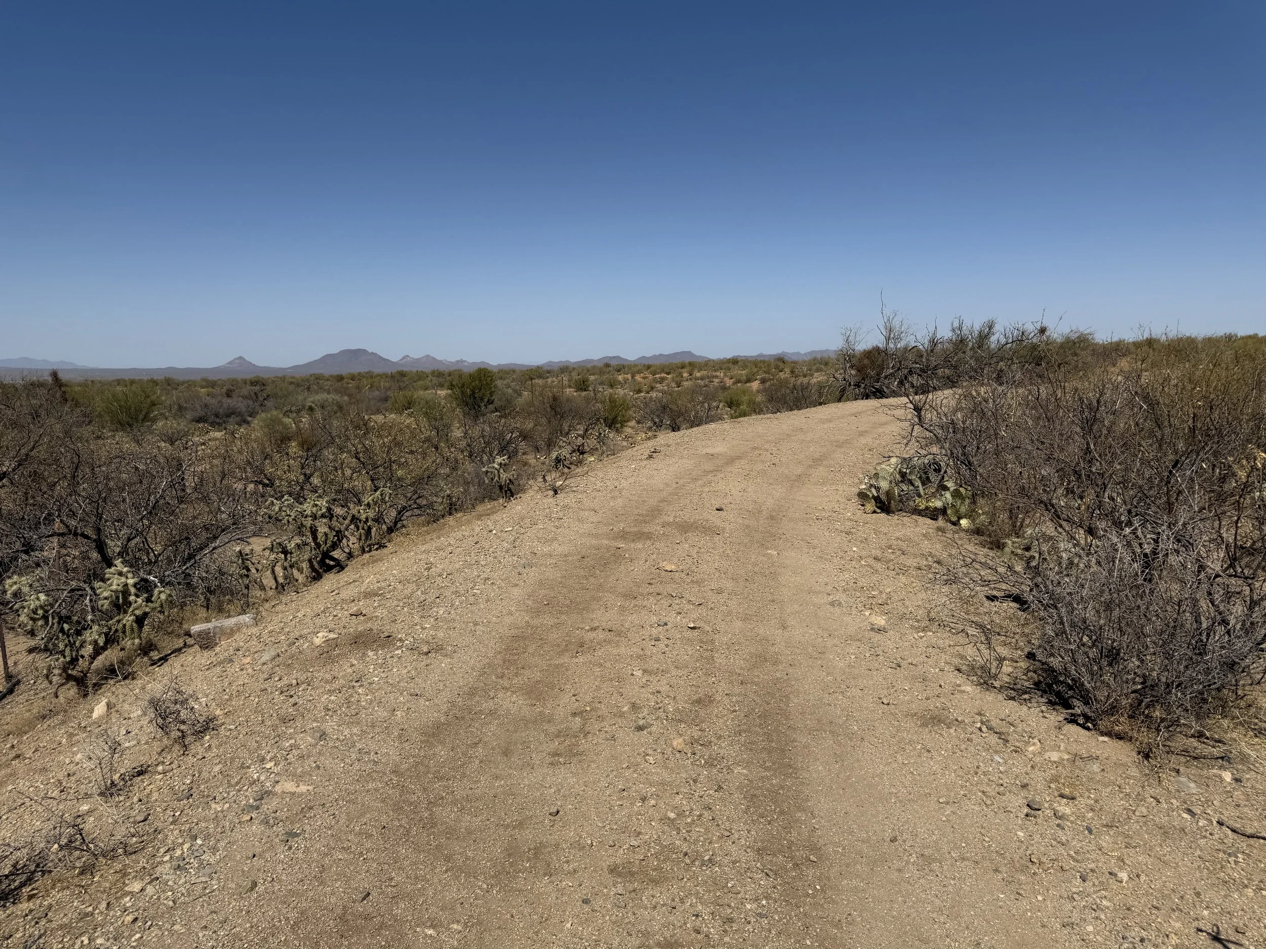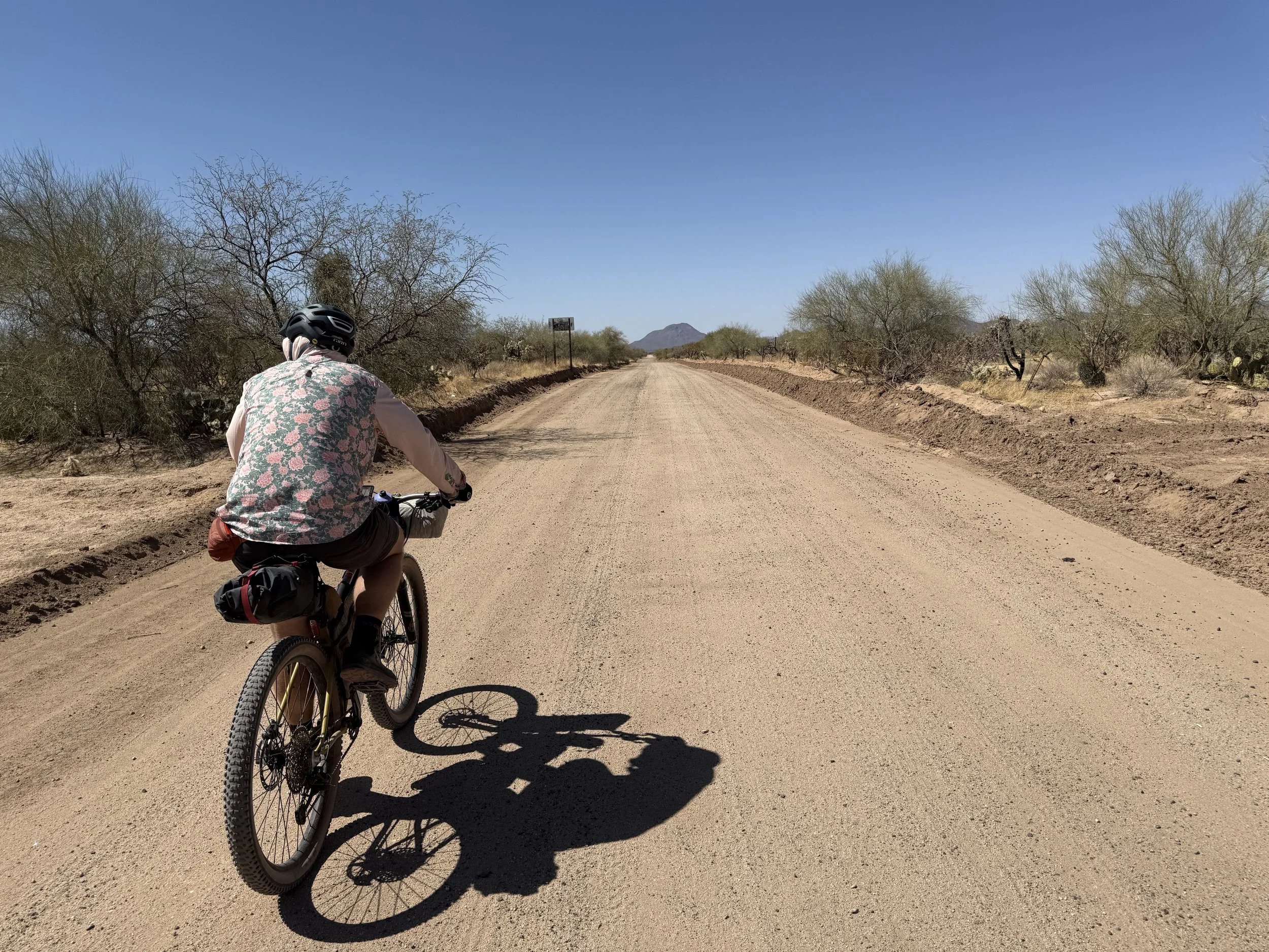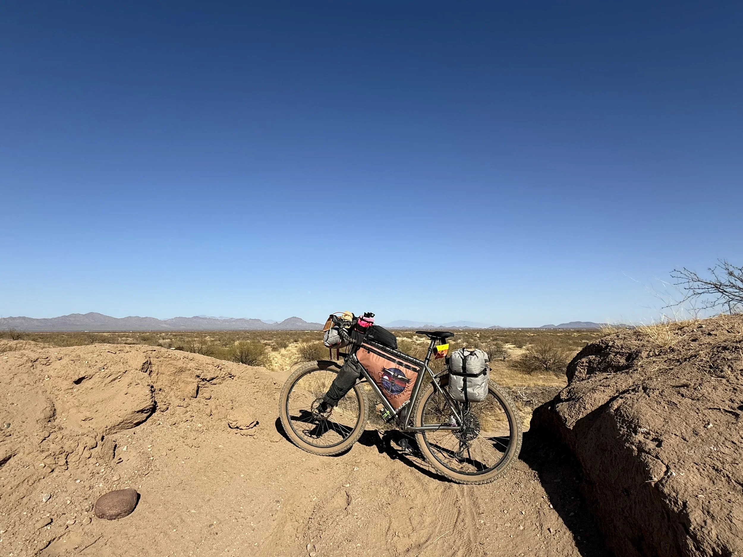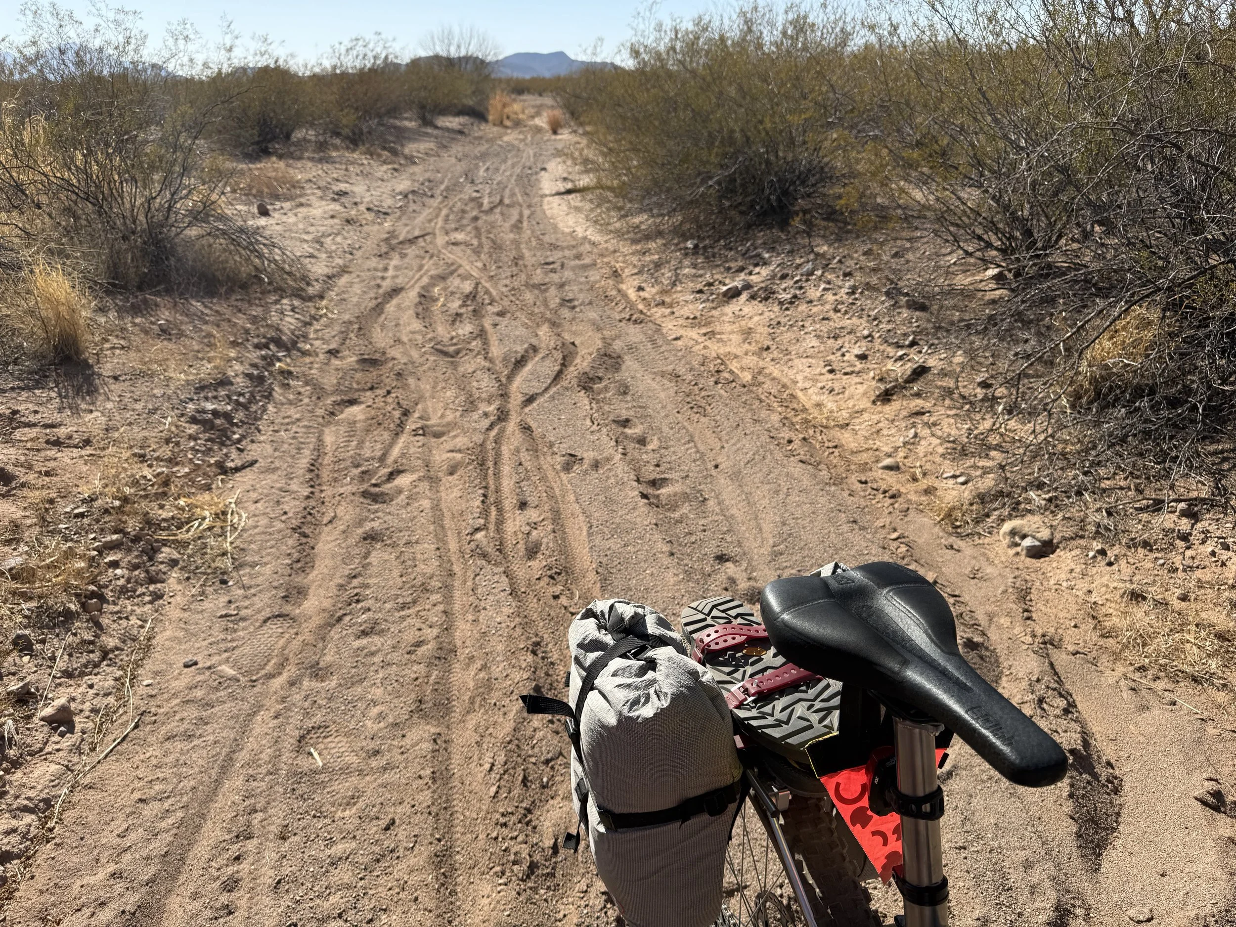 The heat settled strong and deep into my bones once more. But the headache was gone and my muscles felt stronger. I got on the bike and pedaled north on dirt roads that headed through rural neighborhoods before depositing me on an absolutely deeply silty powerline doubletrack. I then swung east through sandy washes chocked to the sides with acacia and mesquite. I ended up off the bike pushing and hauling it along the drainage until I climbed a small hill and hit doubletrack that quickly decayed to a crazy rocky track across small hills. I got off to take a picture and laugh the riverbed it felt I was riding. The road eventually smoothed as I coasted across an expansive floodplain all baked in the heat with silt so deep that it sunk up to my ankles while standing. My bike floundered and wove through the soft substrate until I climbed another hill and took in a view of the landscape. Then it was downhill and across more flat silt to where the SAUER intersected with Sandario Rd.