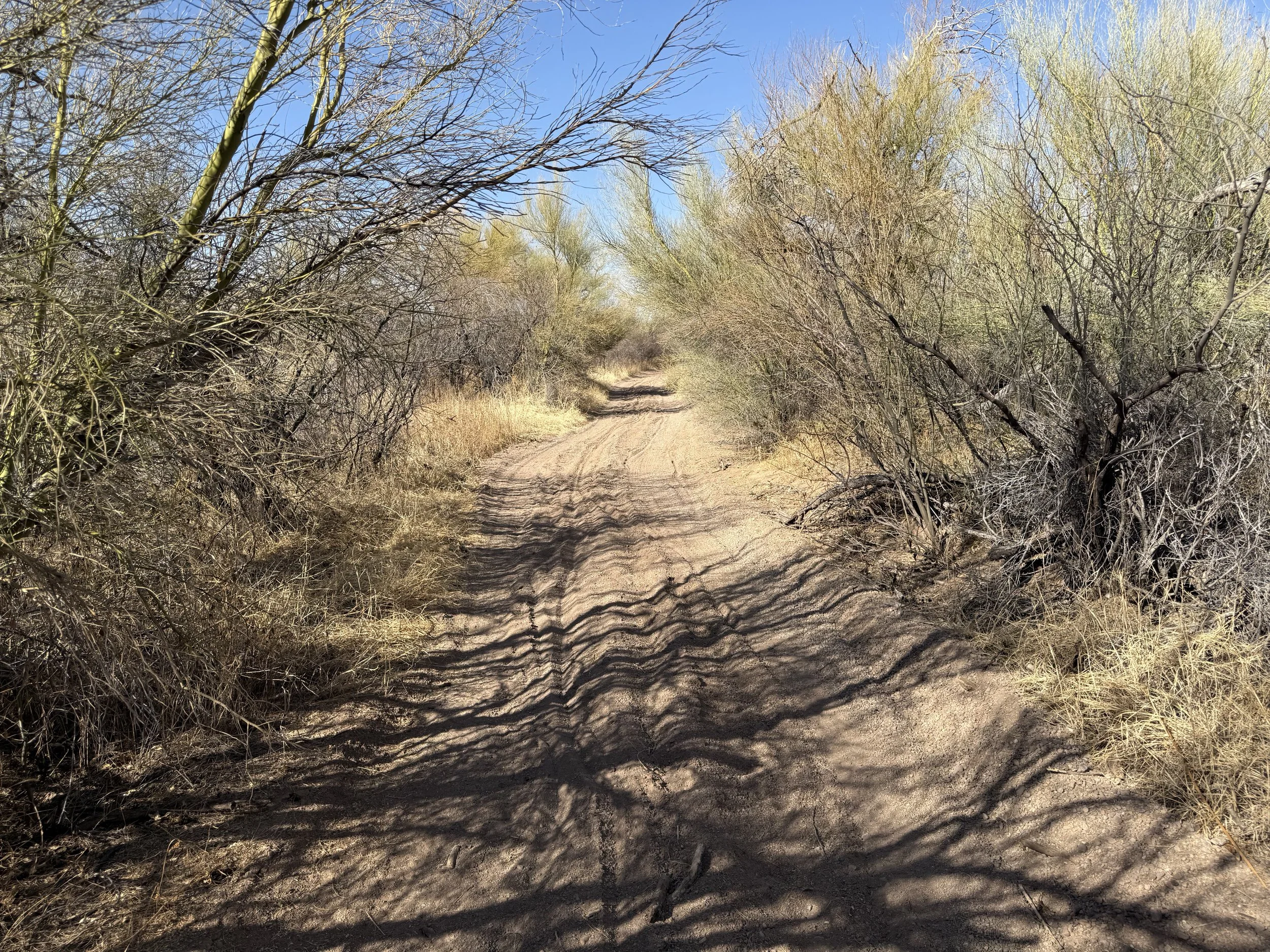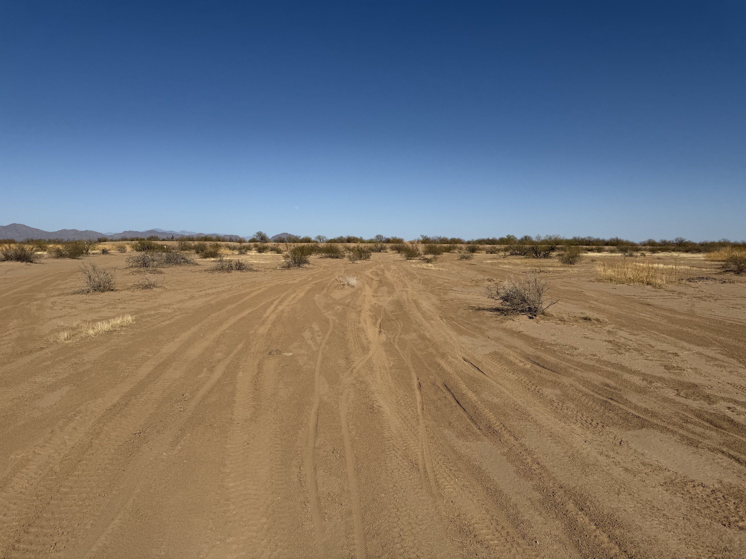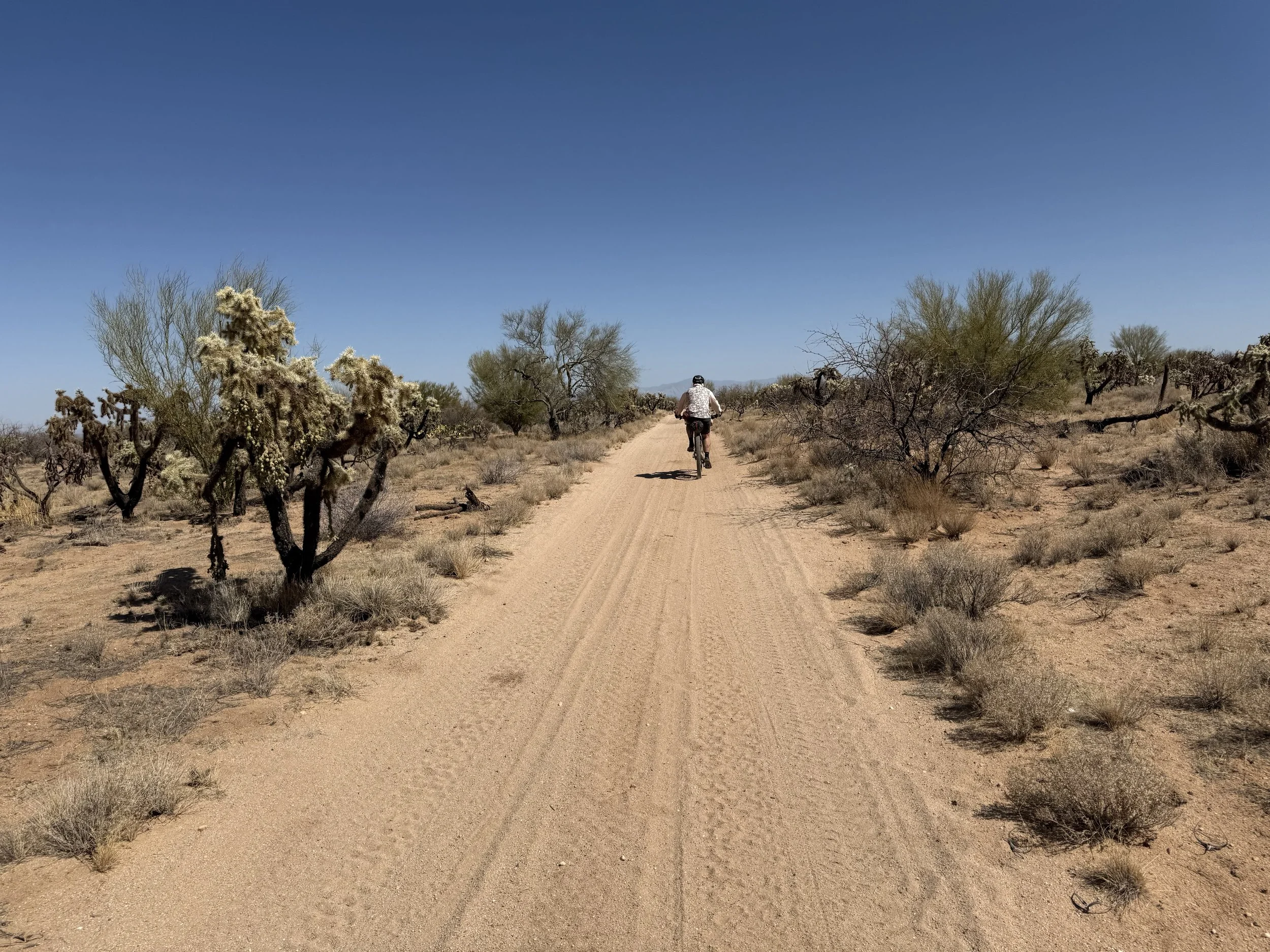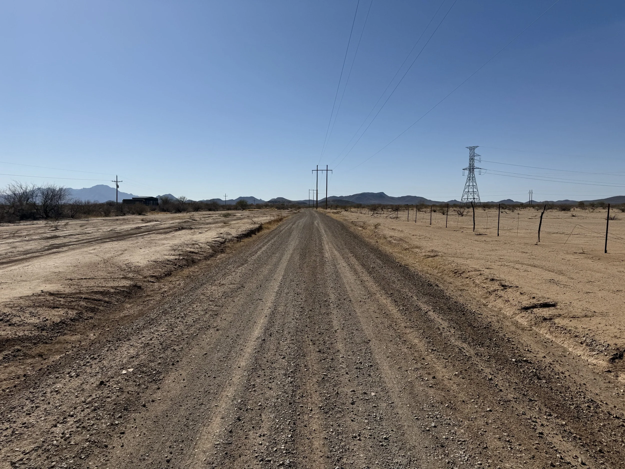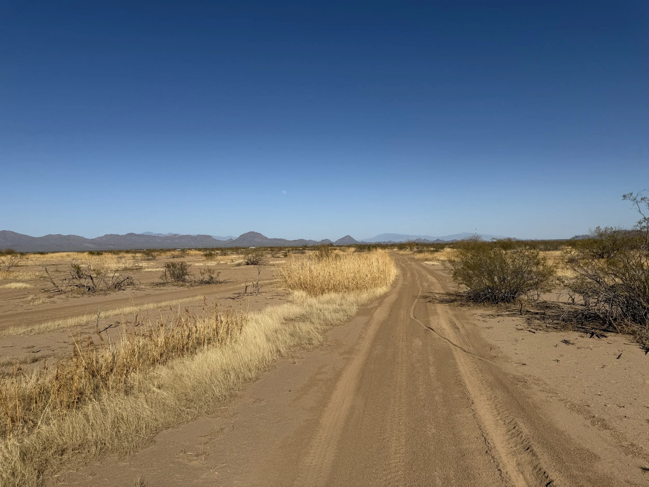 The heat settled strong and deep into my bones once more. But the headache was gone and my muscles felt stronger. I got on the bike and pedaled north on dirt roads that headed through rural neighborhoods before depositing me on an absolutely deeply silty powerline doubletrack. I then swung east through sandy washes chocked to the sides with acacia and mesquite. I ended up off the bike pushing and hauling it along the drainage until I climbed a small hill and hit doubletrack that quickly decayed to a crazy rocky track across small hills. I got off to take a picture and laugh the riverbed it felt I was riding. The road eventually smoothed as I coasted across an expansive floodplain all baked in the heat with silt so deep that it sunk up to my ankles while standing. My bike floundered and wove through the soft substrate until I climbed another hill and took in a view of the landscape. Then it was downhill and across more flat silt to where the SAUER intersected with Sandario Rd.