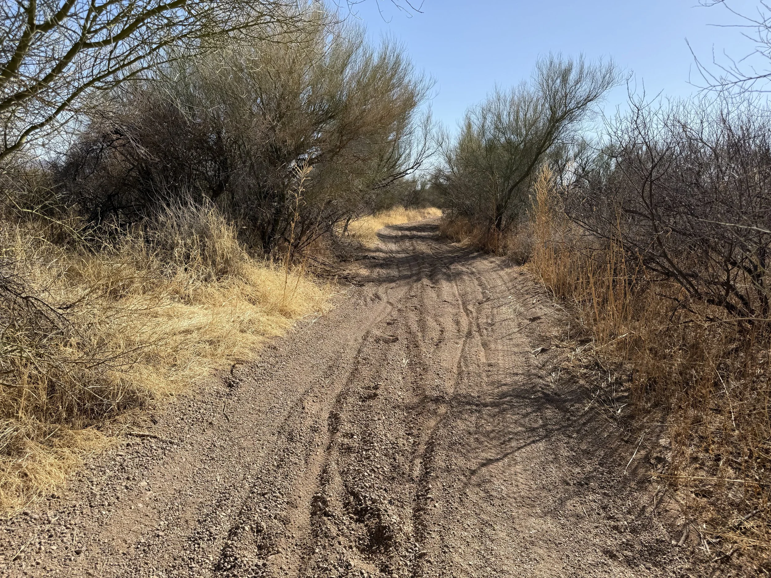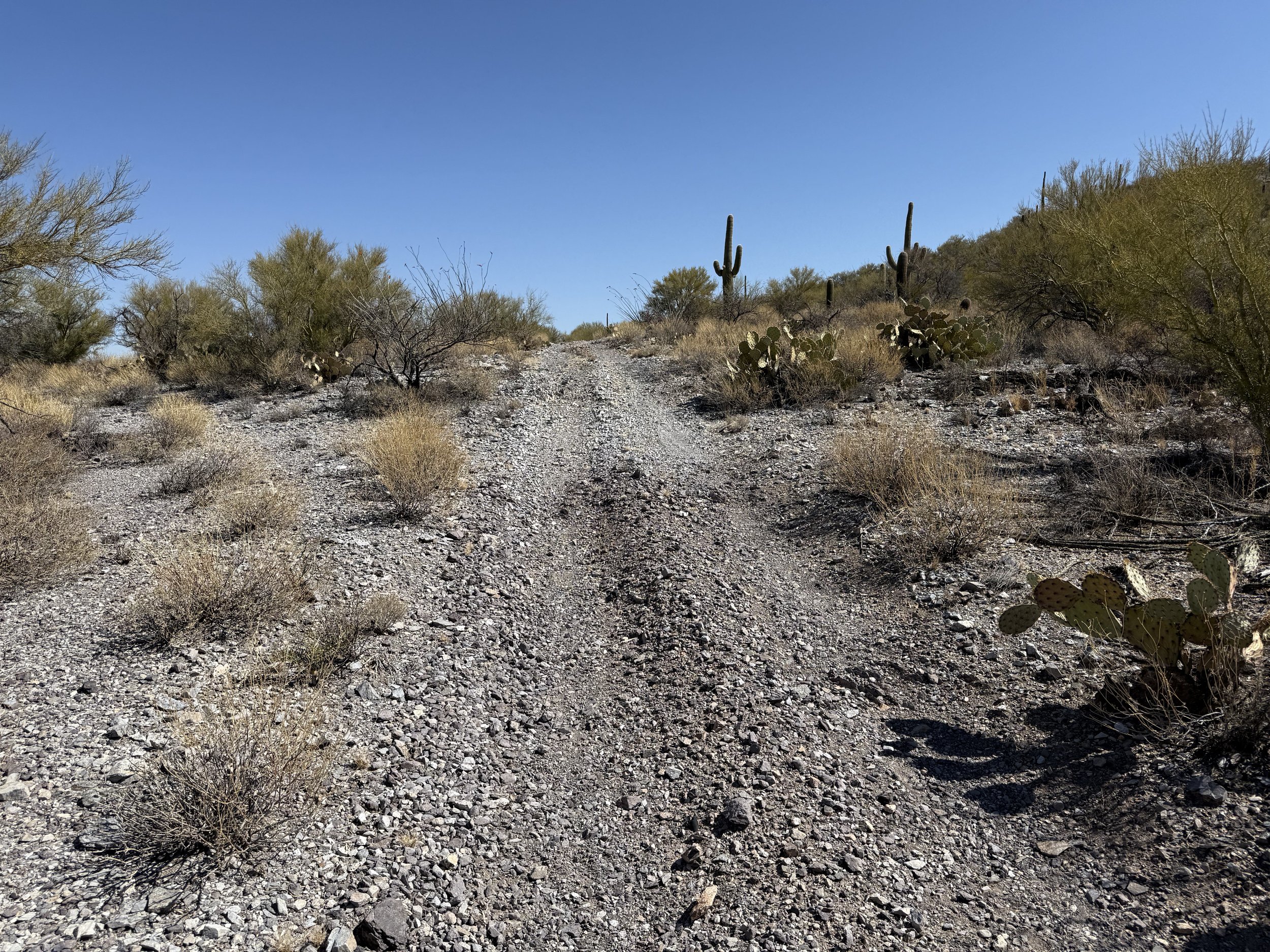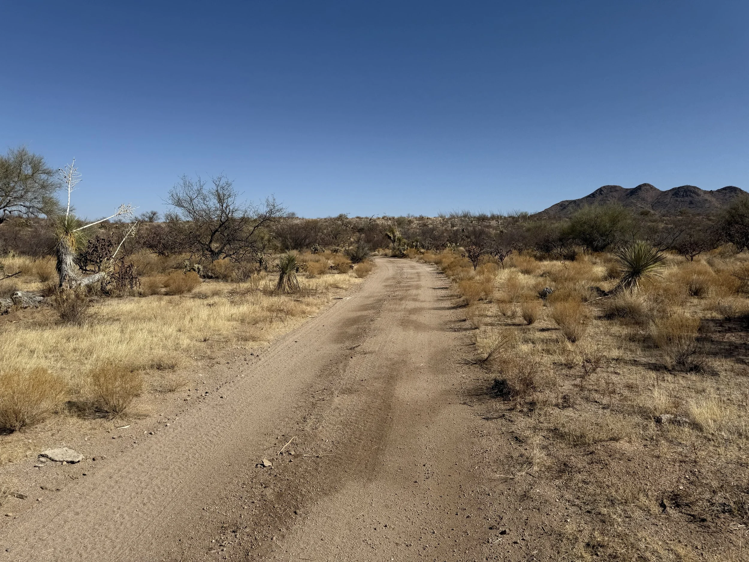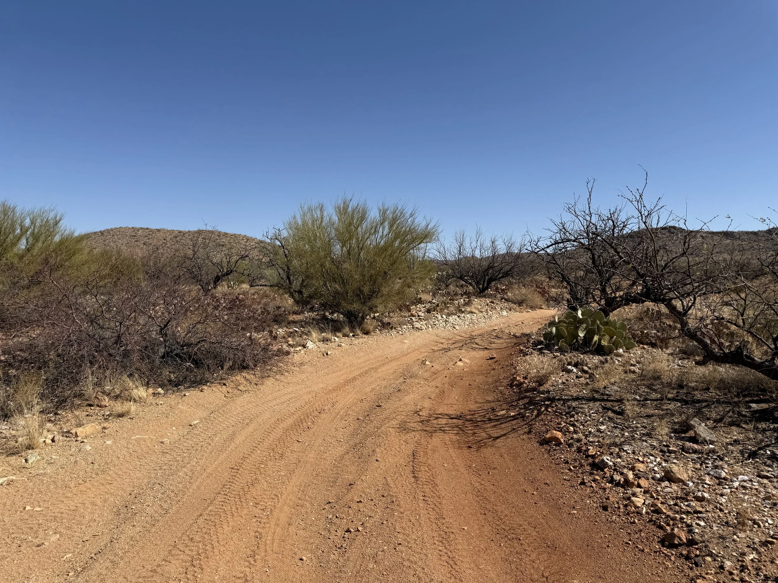 The heat settled strong and deep into my bones once more. But the headache was gone and my muscles felt stronger. I got on the bike and pedaled north on dirt roads that headed through rural neighborhoods before depositing me on an absolutely deeply silty powerline doubletrack. I then swung east through sandy washes chocked to the sides with acacia and mesquite. I ended up off the bike pushing and hauling it along the drainage until I climbed a small hill and hit doubletrack that quickly decayed to a crazy rocky track across small hills. I got off to take a picture and laugh the riverbed it felt I was riding. The road eventually smoothed as I coasted across an expansive floodplain all baked in the heat with silt so deep that it sunk up to my ankles while standing. My bike floundered and wove through the soft substrate until I climbed another hill and took in a view of the landscape. Then it was downhill and across more flat silt to where the SAUER intersected with Sandario Rd.