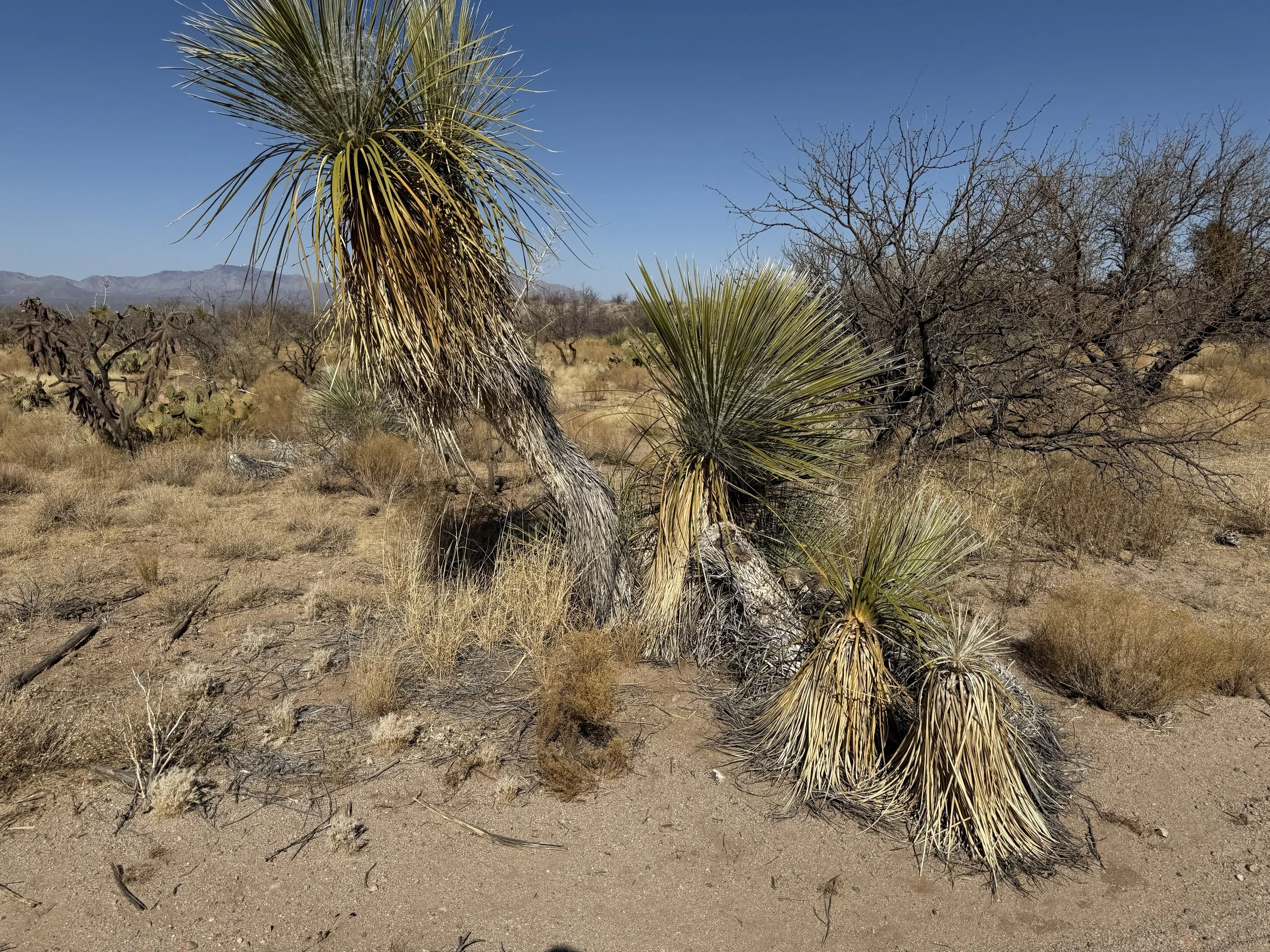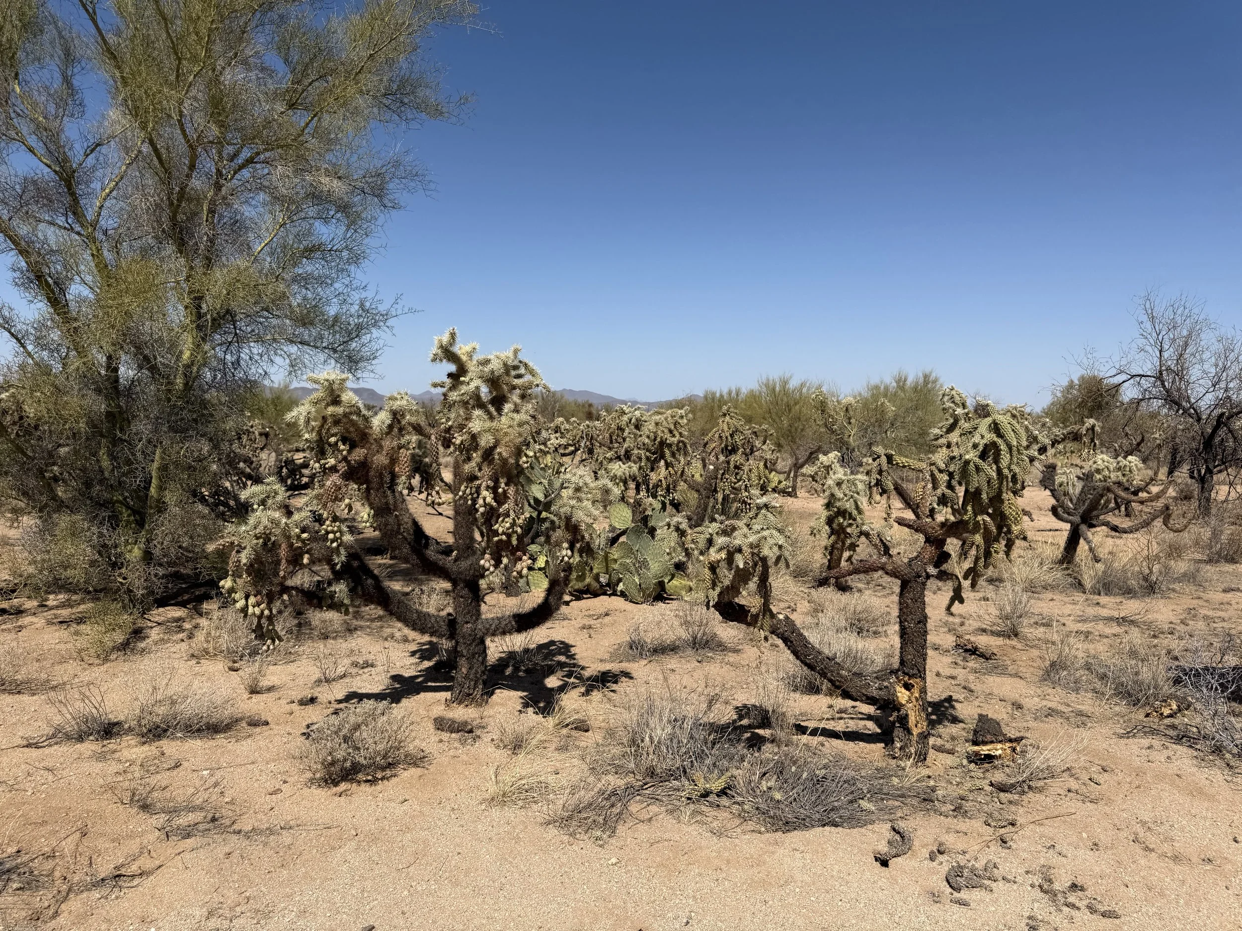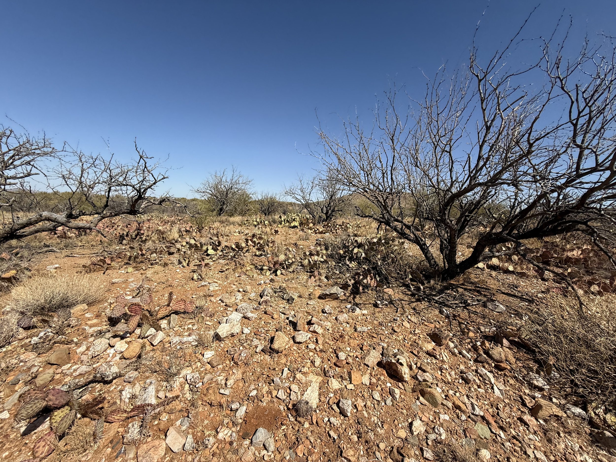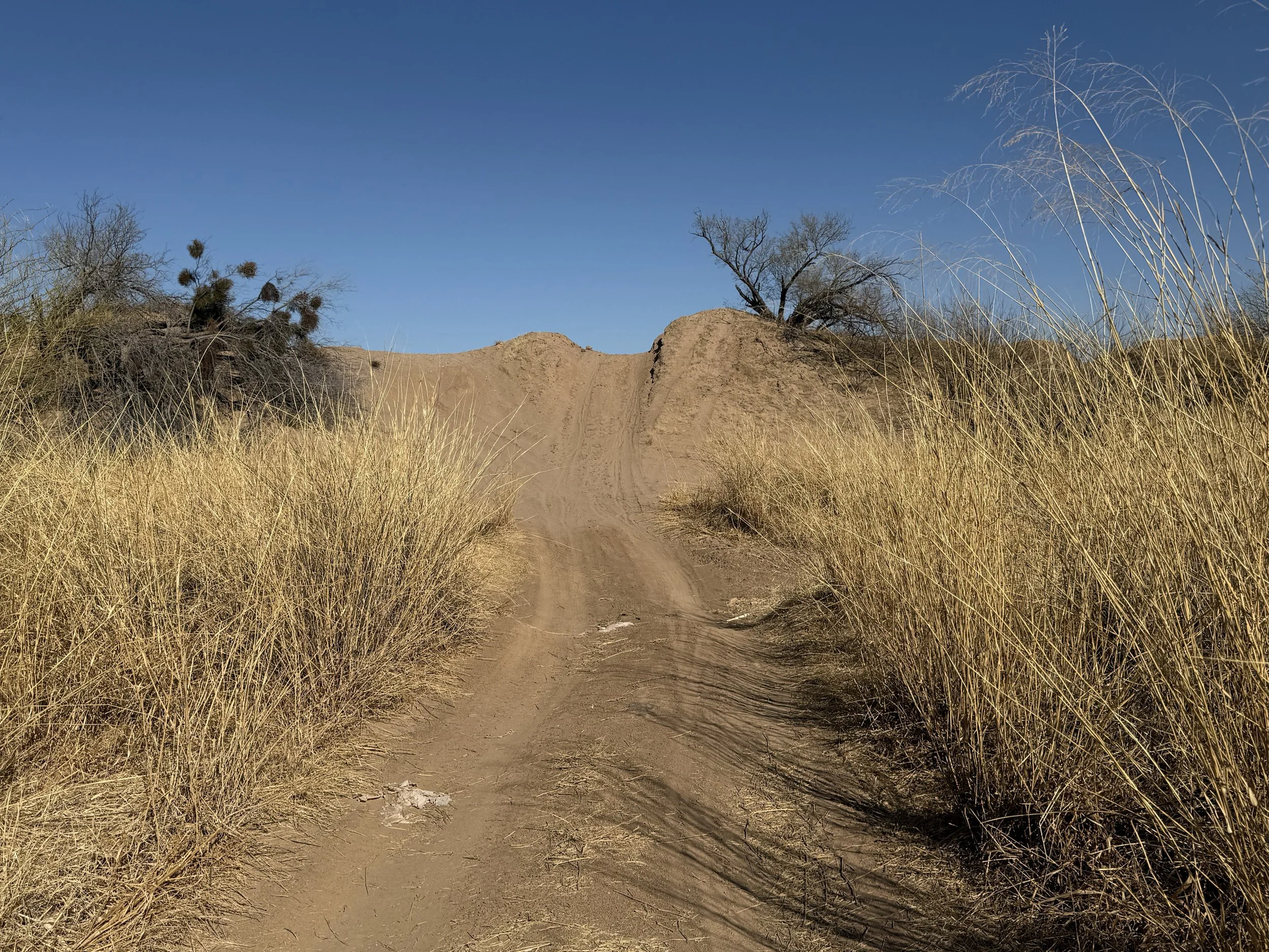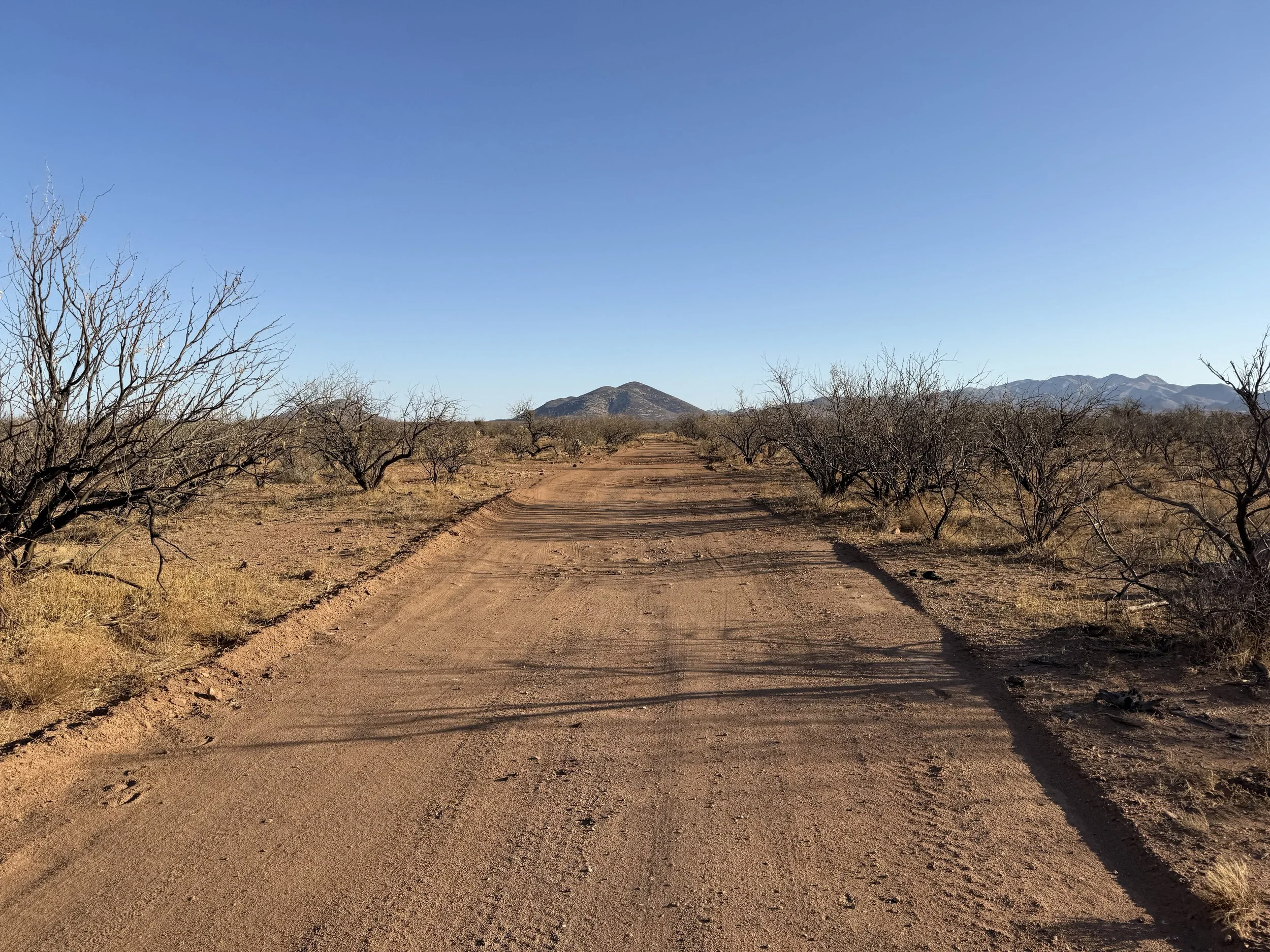 The heat settled strong and deep into my bones once more. But the headache was gone and my muscles felt stronger. I got on the bike and pedaled north on dirt roads that headed through rural neighborhoods before depositing me on an absolutely deeply silty powerline doubletrack. I then swung east through sandy washes chocked to the sides with acacia and mesquite. I ended up off the bike pushing and hauling it along the drainage until I climbed a small hill and hit doubletrack that quickly decayed to a crazy rocky track across small hills. I got off to take a picture and laugh the riverbed it felt I was riding. The road eventually smoothed as I coasted across an expansive floodplain all baked in the heat with silt so deep that it sunk up to my ankles while standing. My bike floundered and wove through the soft substrate until I climbed another hill and took in a view of the landscape. Then it was downhill and across more flat silt to where the SAUER intersected with Sandario Rd.