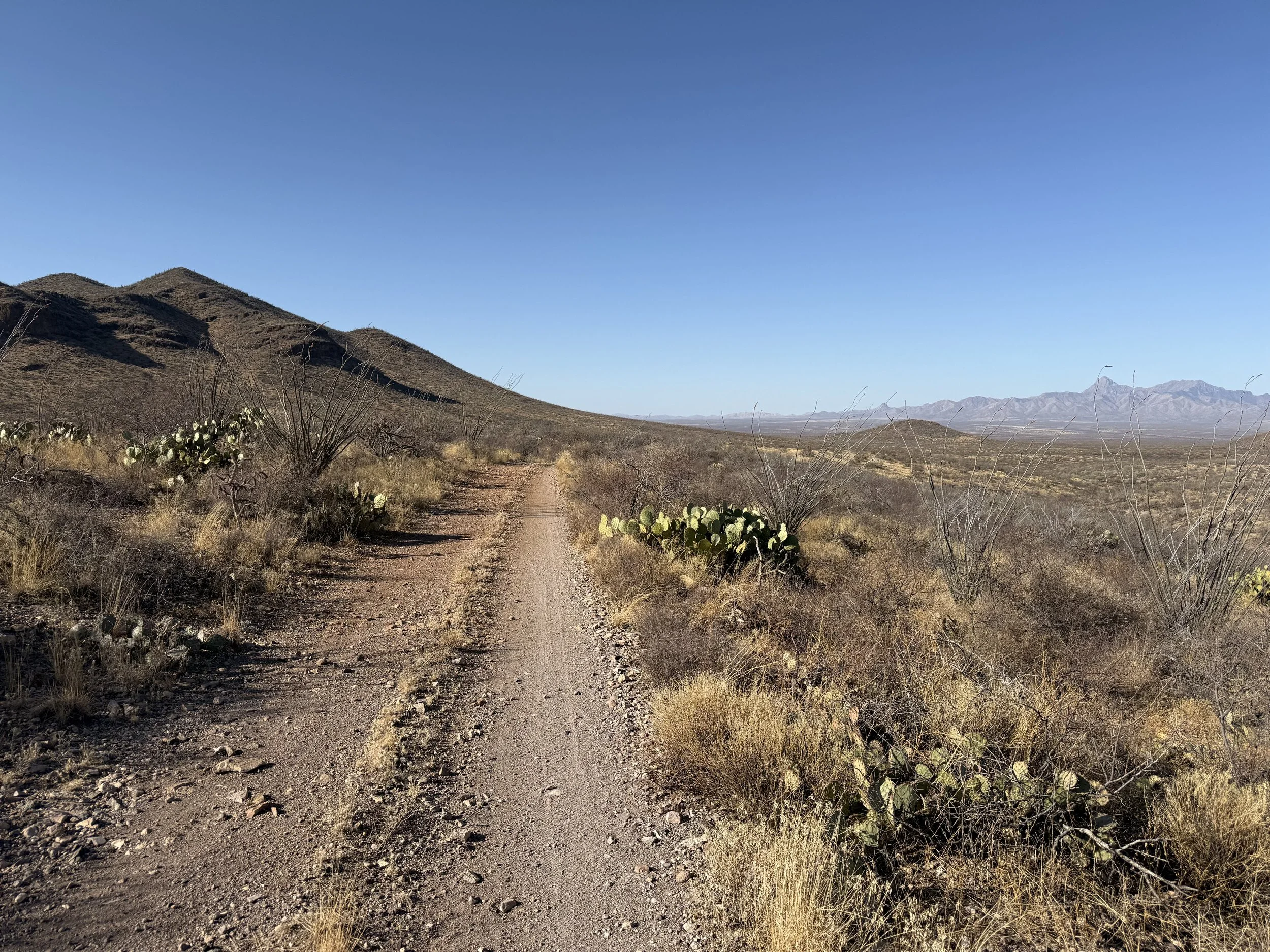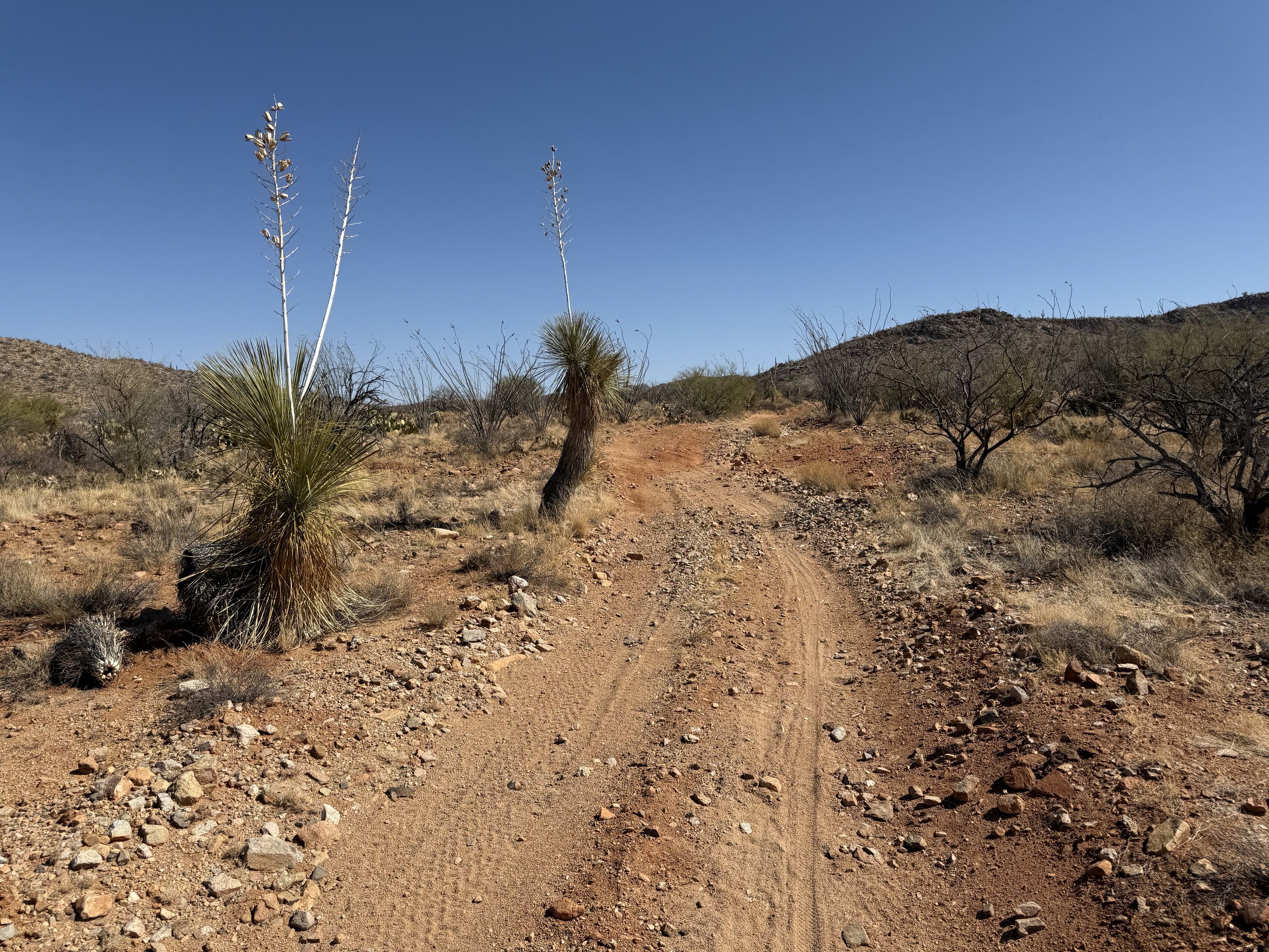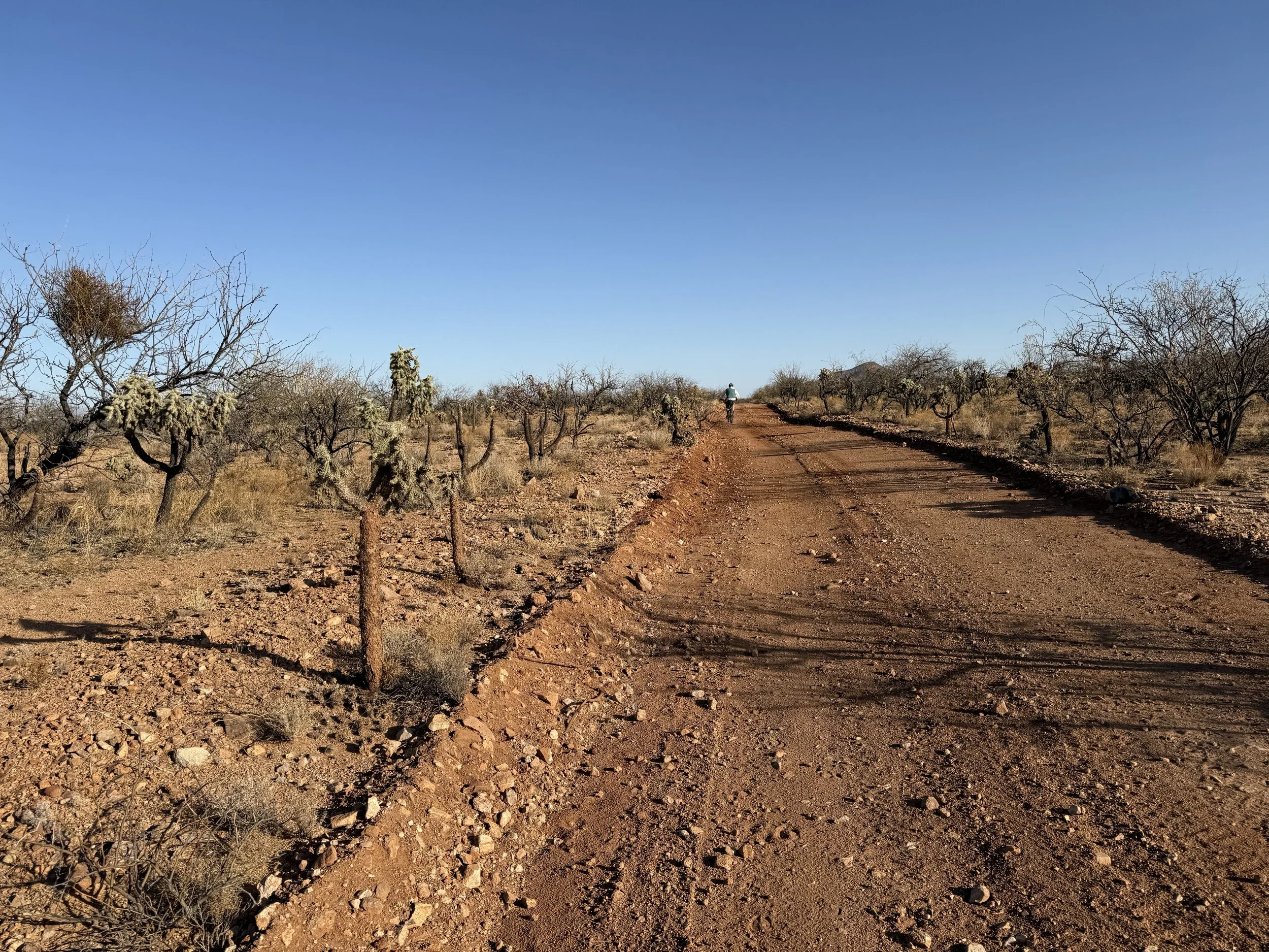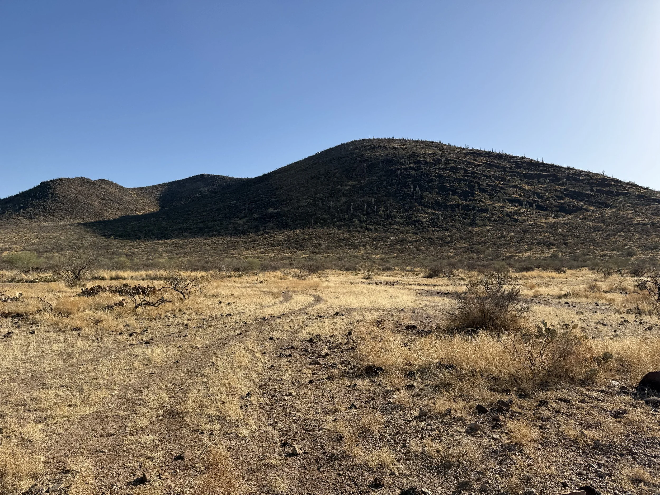 The low Sonoran made a gradual appearance in the form of large columnar saguaro growing up through the branches of their nurse trees. I could feel the shift in ecosystem as the hills got rockier and we adjacently made our way north towards Tucson. My shoulders felt tight and my neck stiff. I could feel the rocky path from yesterday that worked its way into my bones through my rigid front fork. A slight headache settled in that ended up lasting a good part of the day. I managed it with frequent shoulder and back stretches along with some Tylenol, but it was naggingly present despite my efforts. Ahead, the Black Hills rose as domed saguaro-studded mounds in the desert. The heat bubbled up hot and cooking. God, the landscape was stucco dried as in foresummer. But I took reassuring gratitude to bear in mind how amazing it was to be riding with a friend along doubletrack in the Sonoran Desert.