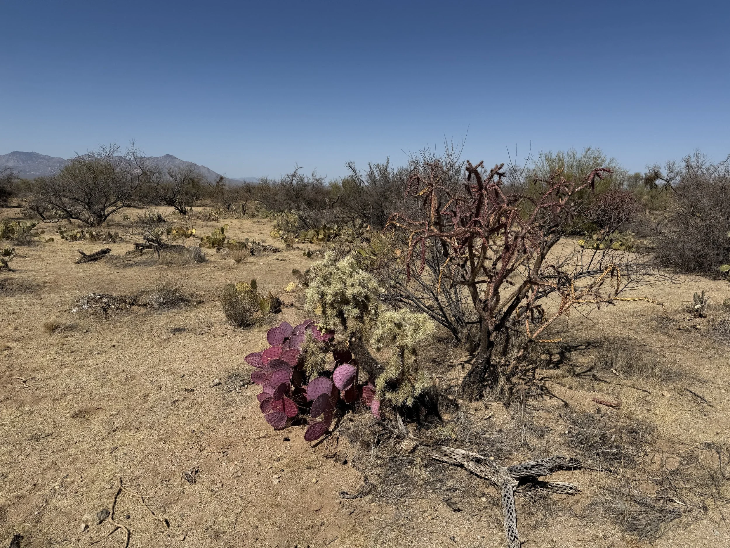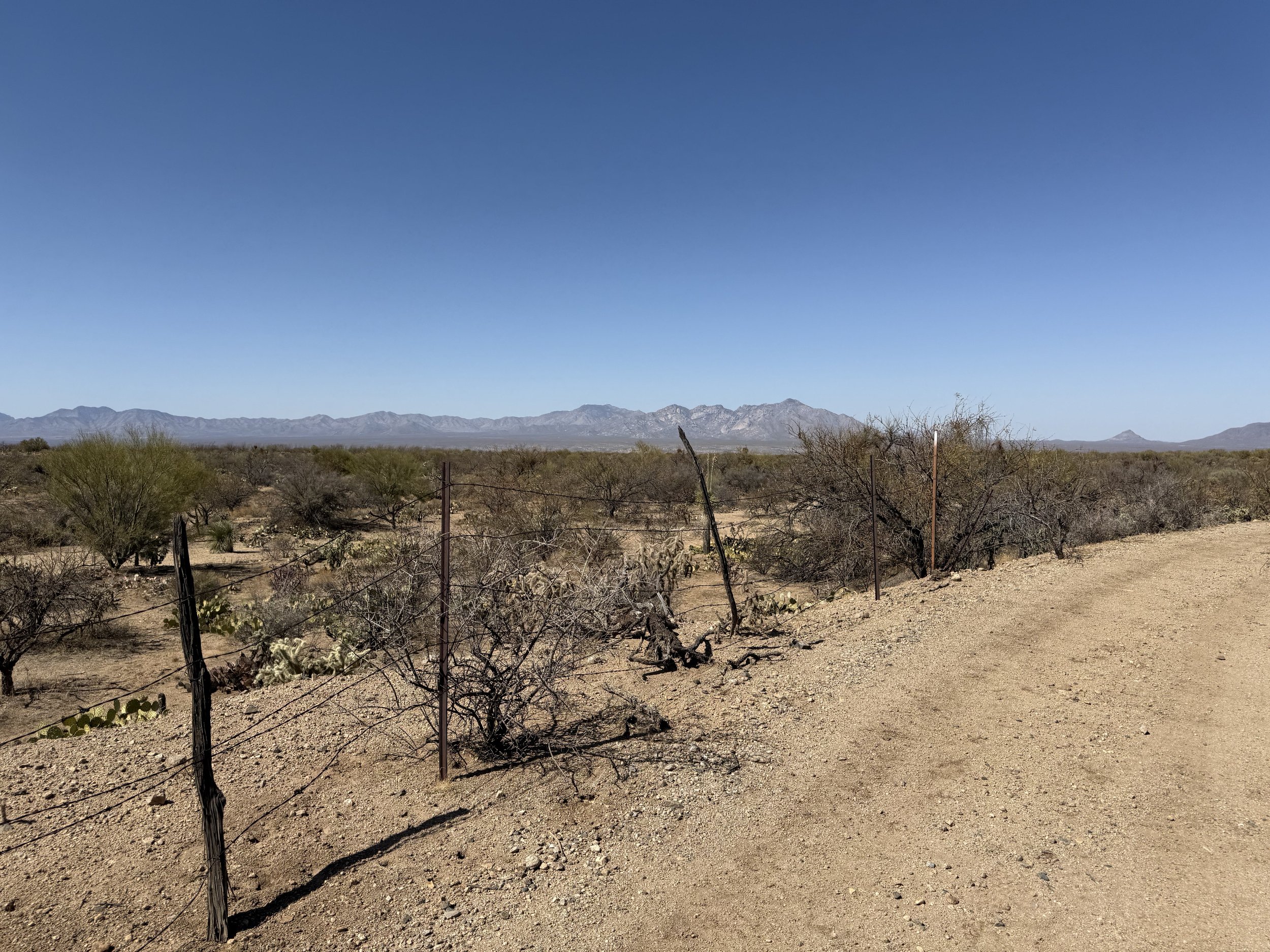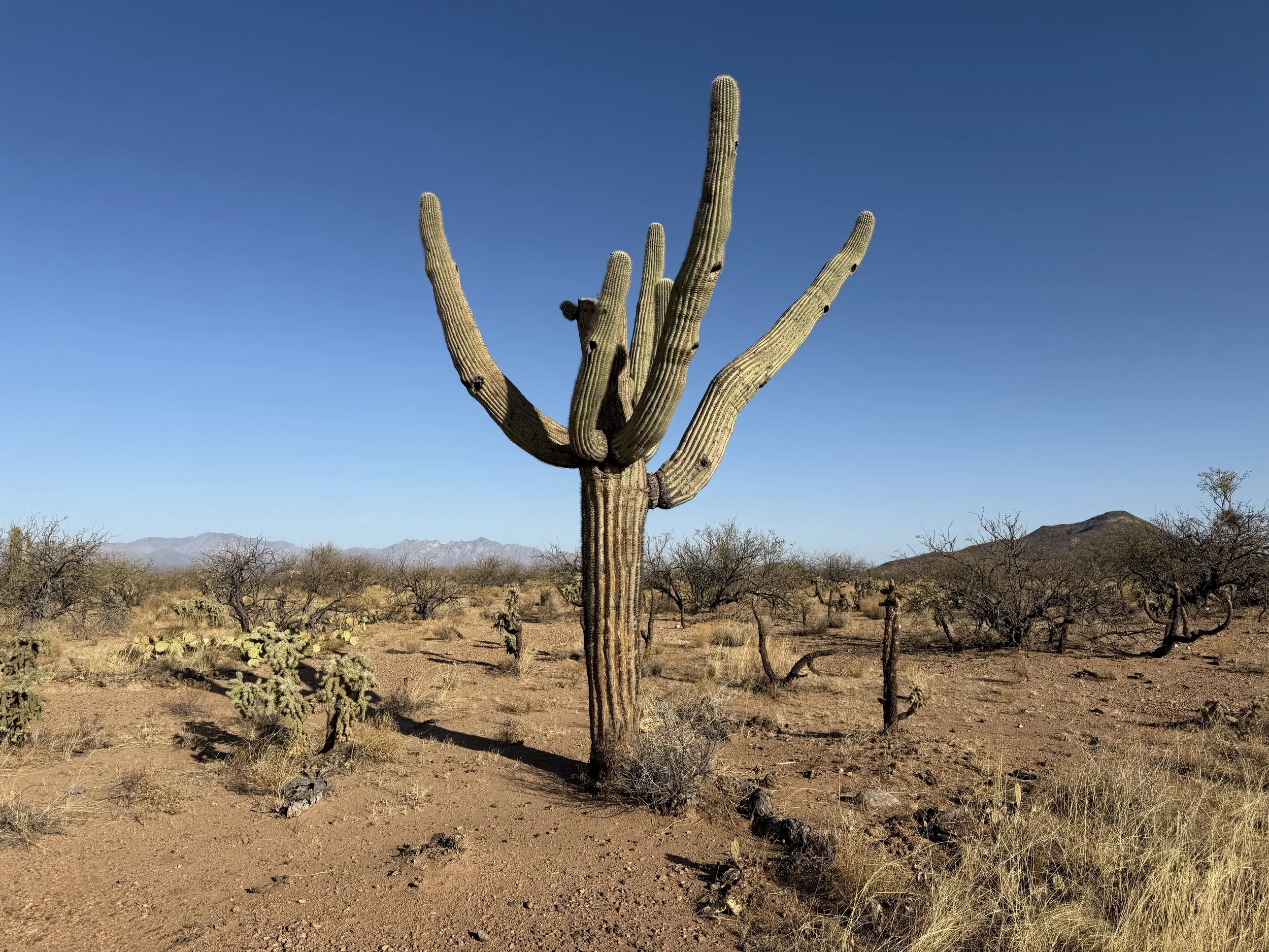 The low Sonoran made a gradual appearance in the form of large columnar saguaro growing up through the branches of their nurse trees. I could feel the shift in ecosystem as the hills got rockier and we adjacently made our way north towards Tucson. My shoulders felt tight and my neck stiff. I could feel the rocky path from yesterday that worked its way into my bones through my rigid front fork. A slight headache settled in that ended up lasting a good part of the day. I managed it with frequent shoulder and back stretches along with some Tylenol, but it was naggingly present despite my efforts. Ahead, the Black Hills rose as domed saguaro-studded mounds in the desert. The heat bubbled up hot and cooking. God, the landscape was stucco dried as in foresummer. But I took reassuring gratitude to bear in mind how amazing it was to be riding with a friend along doubletrack in the Sonoran Desert.