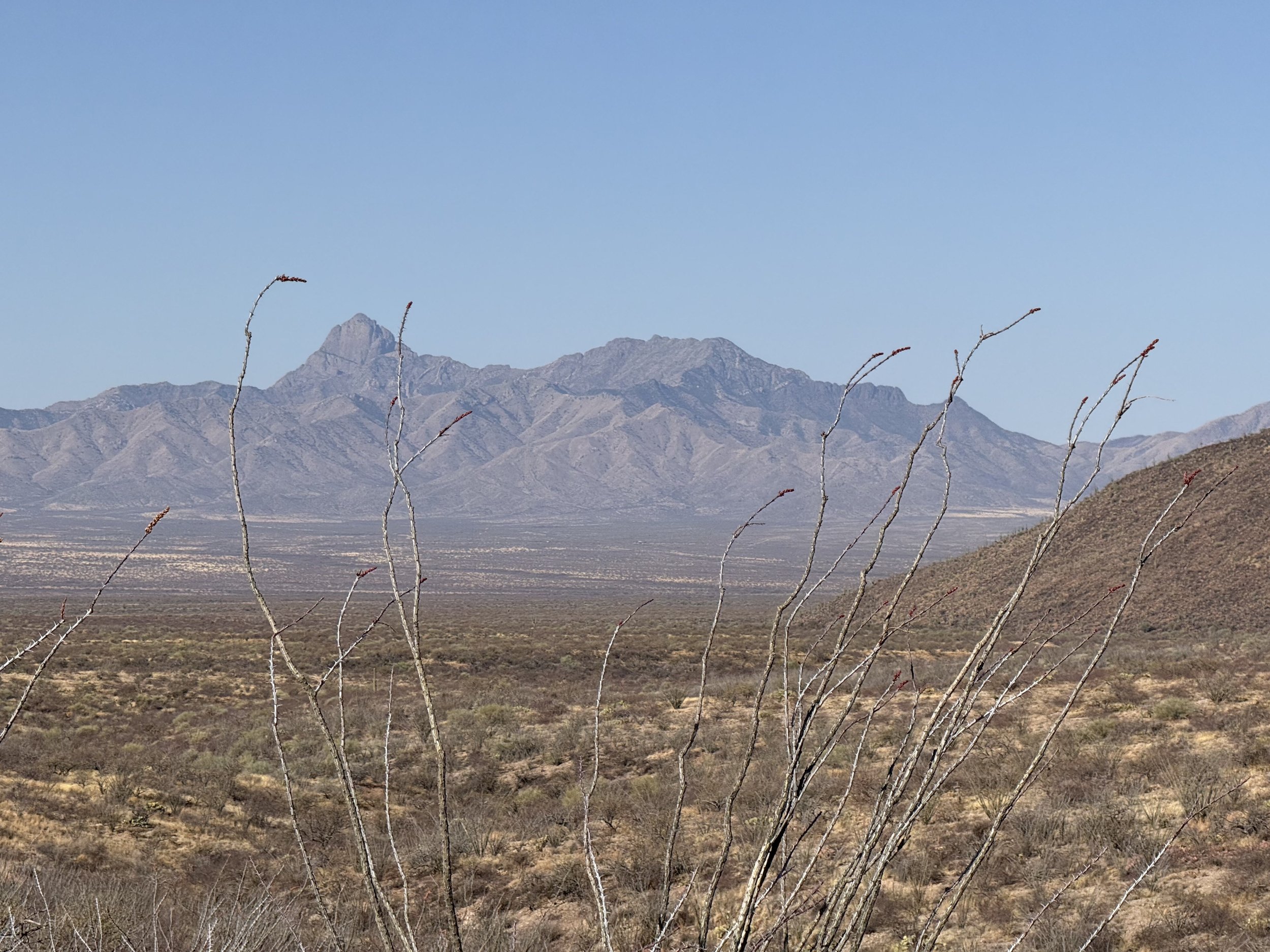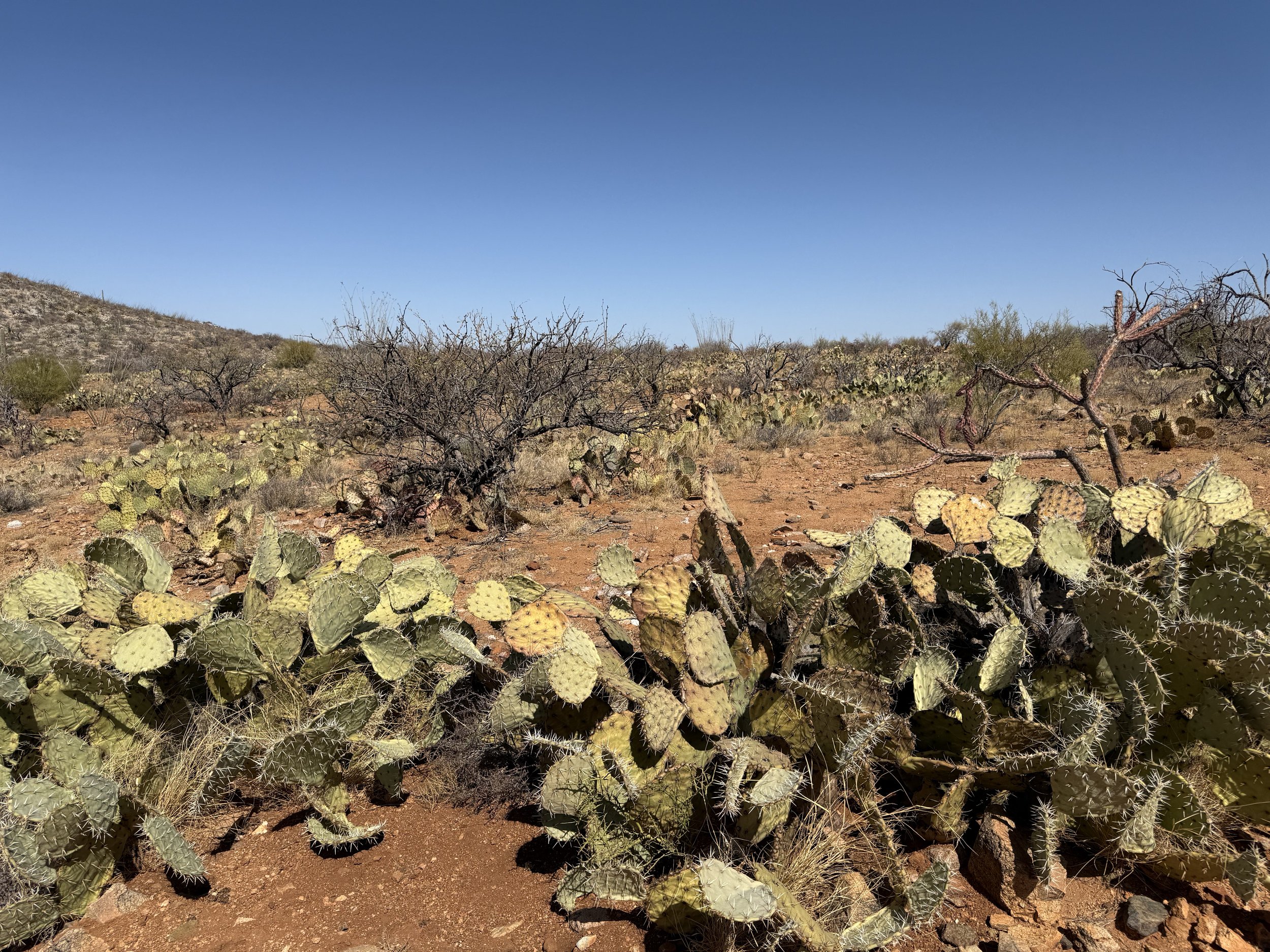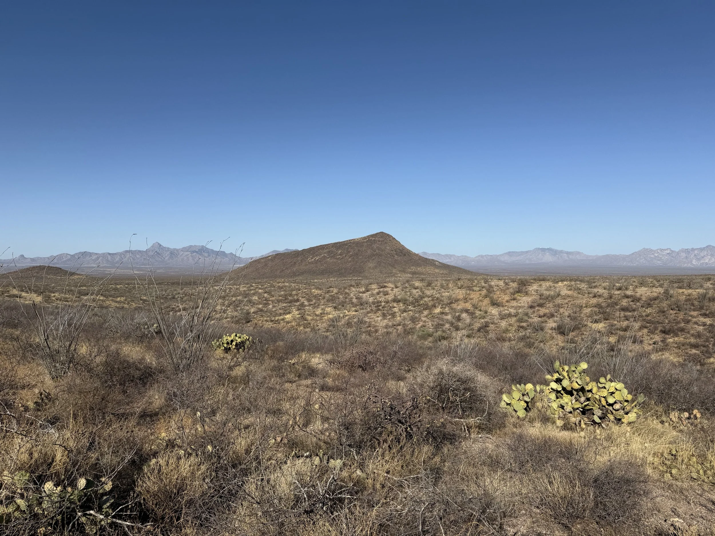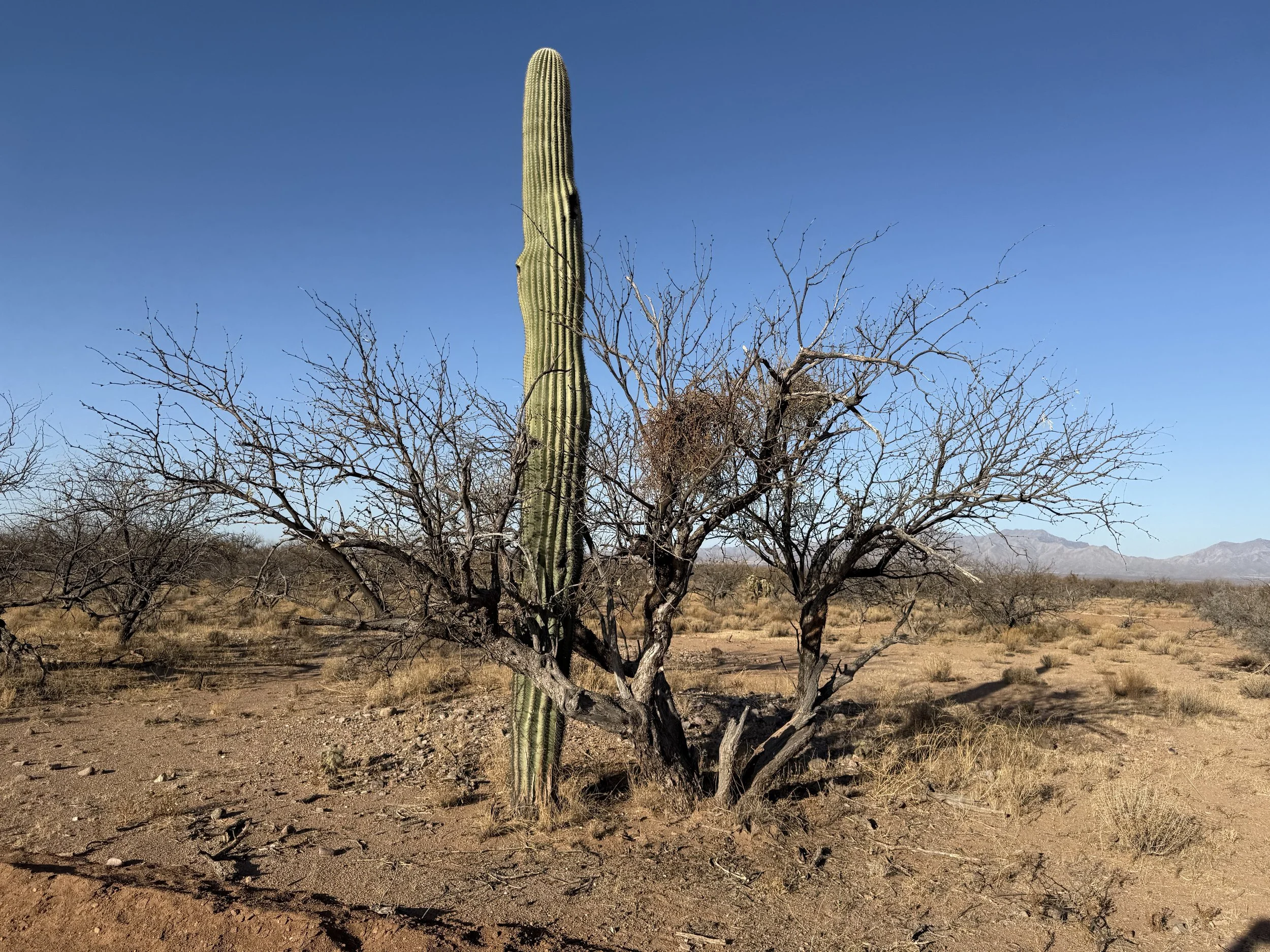 The low Sonoran made a gradual appearance in the form of large columnar saguaro growing up through the branches of their nurse trees. I could feel the shift in ecosystem as the hills got rockier and we adjacently made our way north towards Tucson. My shoulders felt tight and my neck stiff. I could feel the rocky path from yesterday that worked its way into my bones through my rigid front fork. A slight headache settled in that ended up lasting a good part of the day. I managed it with frequent shoulder and back stretches along with some Tylenol, but it was naggingly present despite my efforts. Ahead, the Black Hills rose as domed saguaro-studded mounds in the desert. The heat bubbled up hot and cooking. God, the landscape was stucco dried as in foresummer. But I took reassuring gratitude to bear in mind how amazing it was to be riding with a friend along doubletrack in the Sonoran Desert.