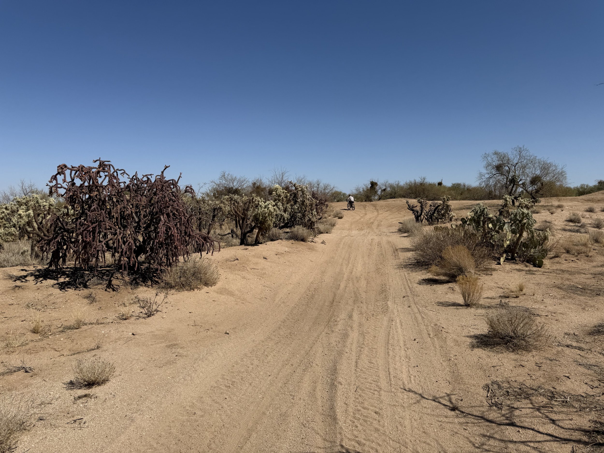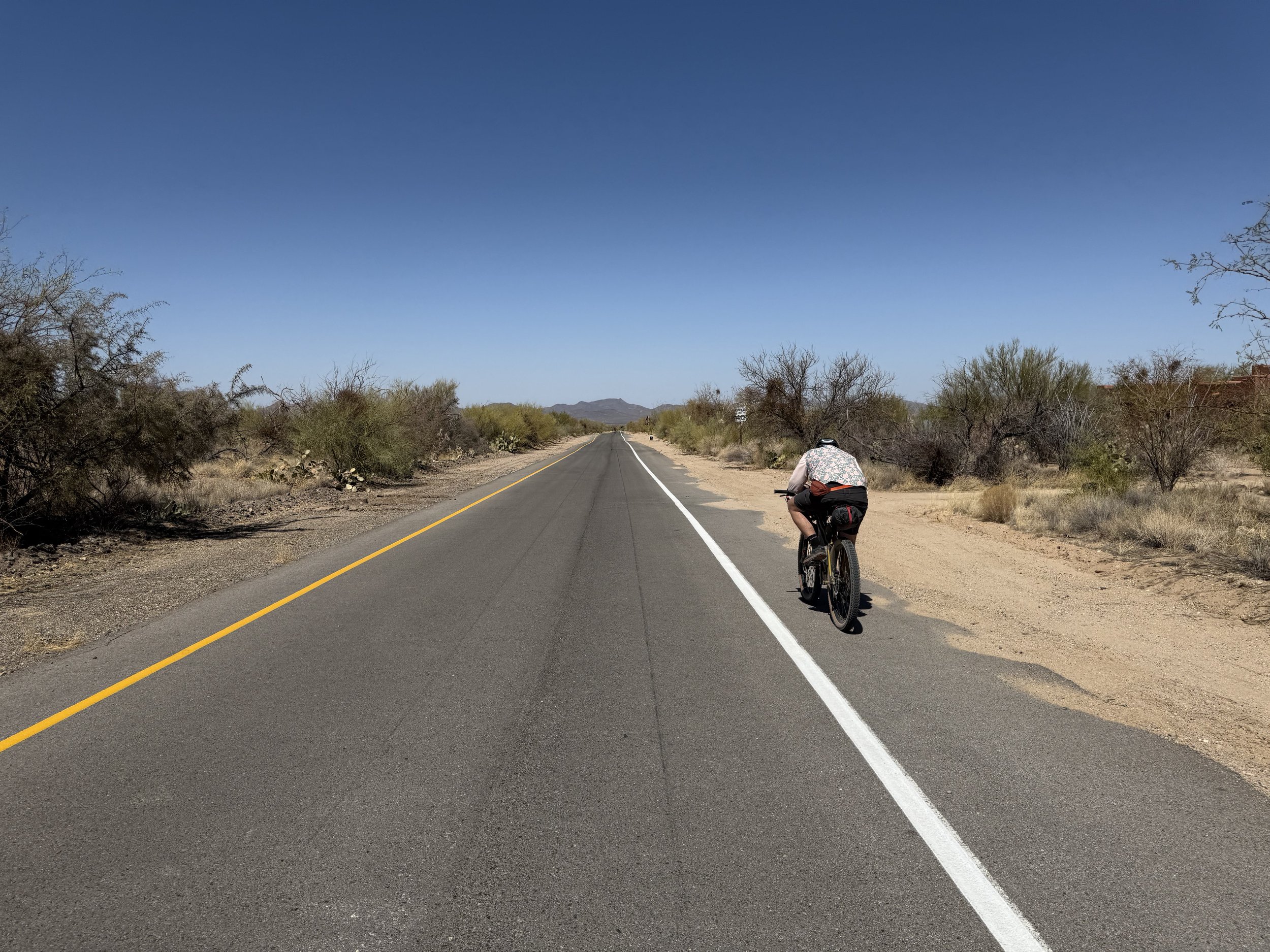 To us both, it was the promise of a straight-away downhill all the way to Three Points. My mood surged as the temperatures kept climbing. I just soaked in the easy riding. And then the route immediately left the pavement to saunter up a sandy wash again.