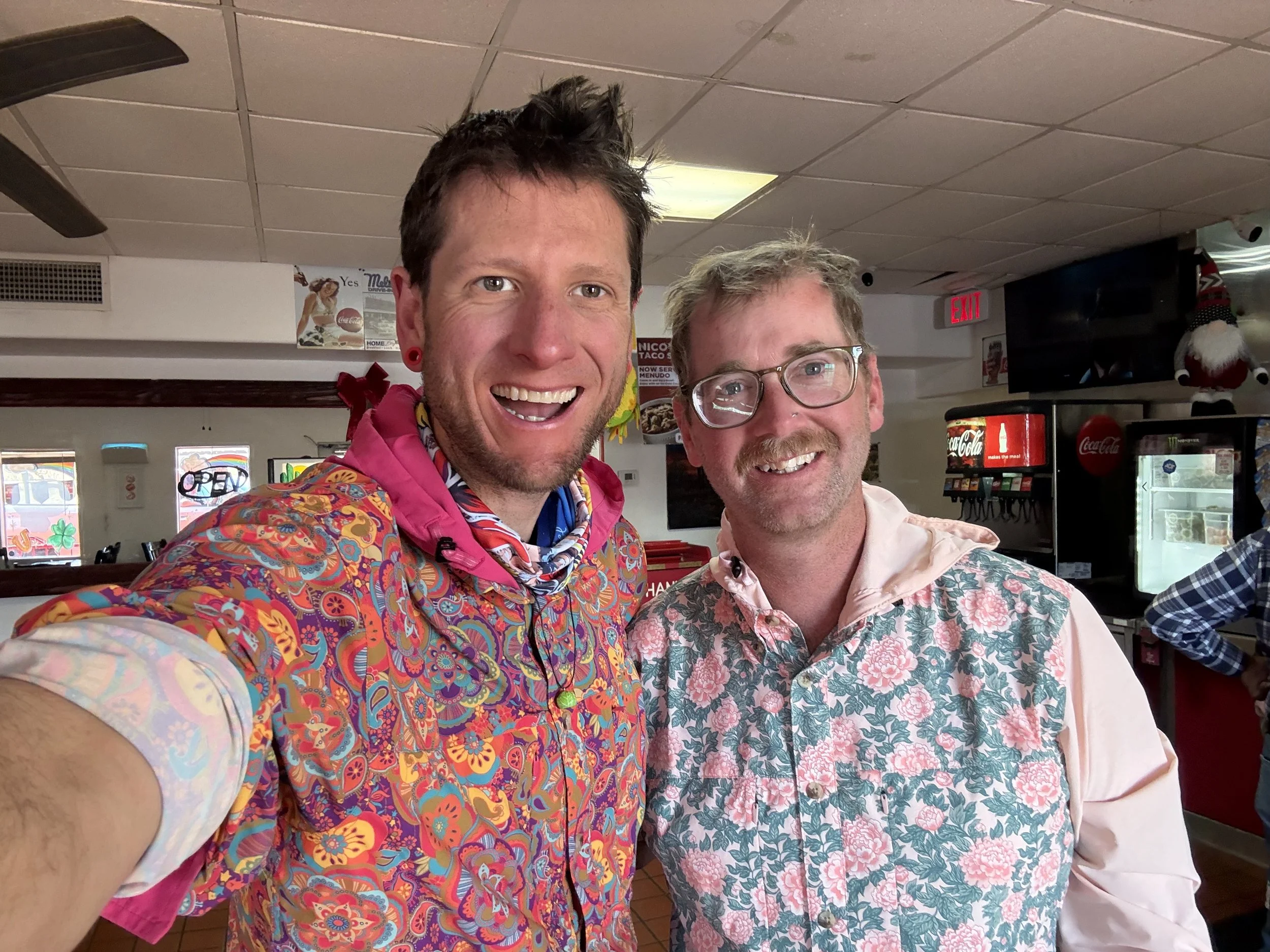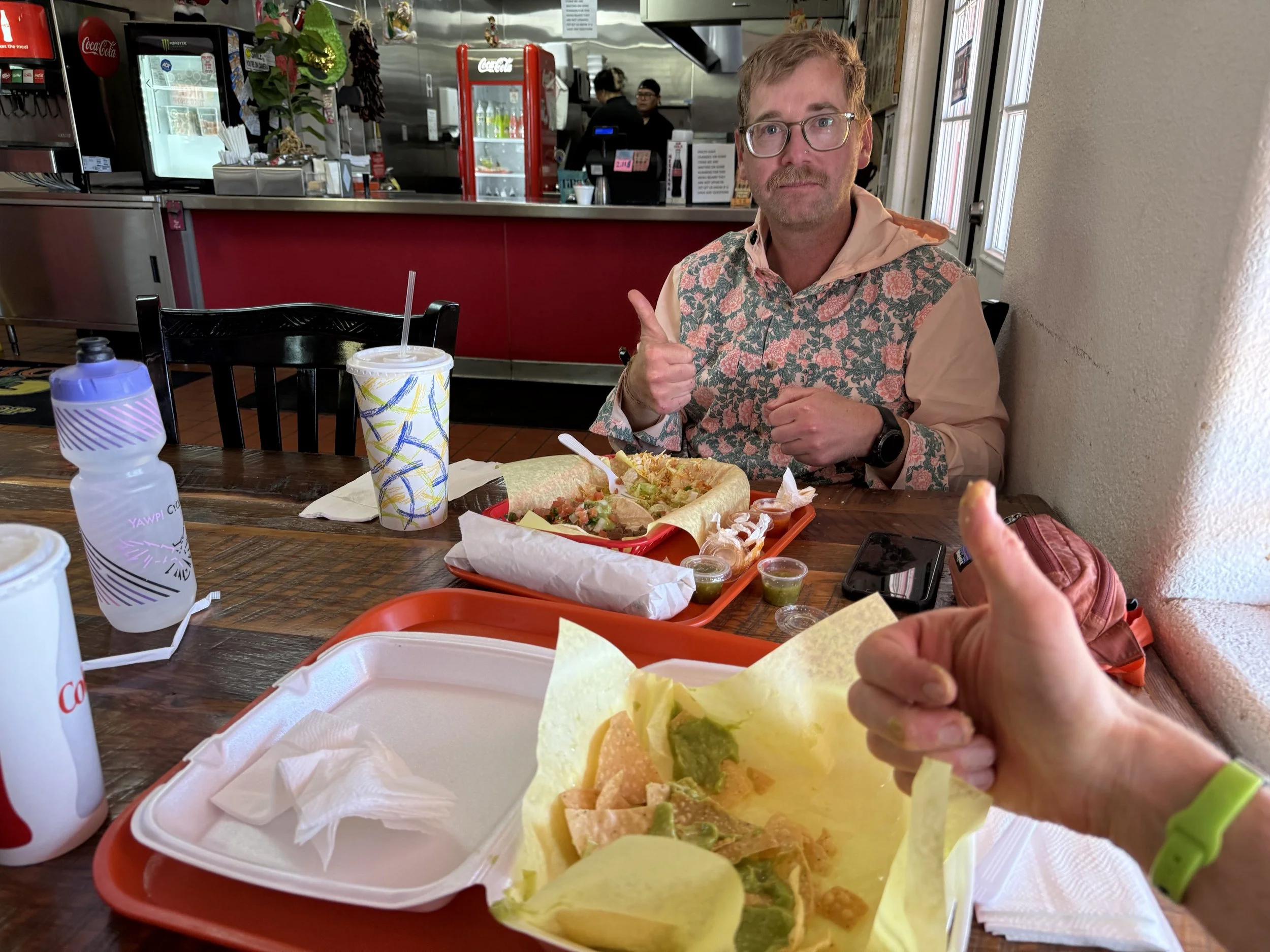 We parked and locked up our bikes outside and then walked into a cool interior saturated with the generous use of air conditioning. It was exactly what I needed. The two of us took time to order burritos, chips, and I opted for a large Powerade from the soda machine. We sat and just ate and ate until my headache dissipated, my body cooled, and my muscles felt normal. The time felt utterly too fast as Josh packed up from eating and got ready to go. We snapped a few photos together, and he was out the door on a fast ride down the highway back to Tucson and work tomorrow. The day was still in the upper 90s, and with my intended stopping point so near, I sat back down to charge my phone, call Janna, and really let the A/C do it's work on my body. I even ordered a second burrito. After another hour passed, I heaed outside to walk over to the nearby Dollar General to purchase some food for dinner and snacks for tomorrow.