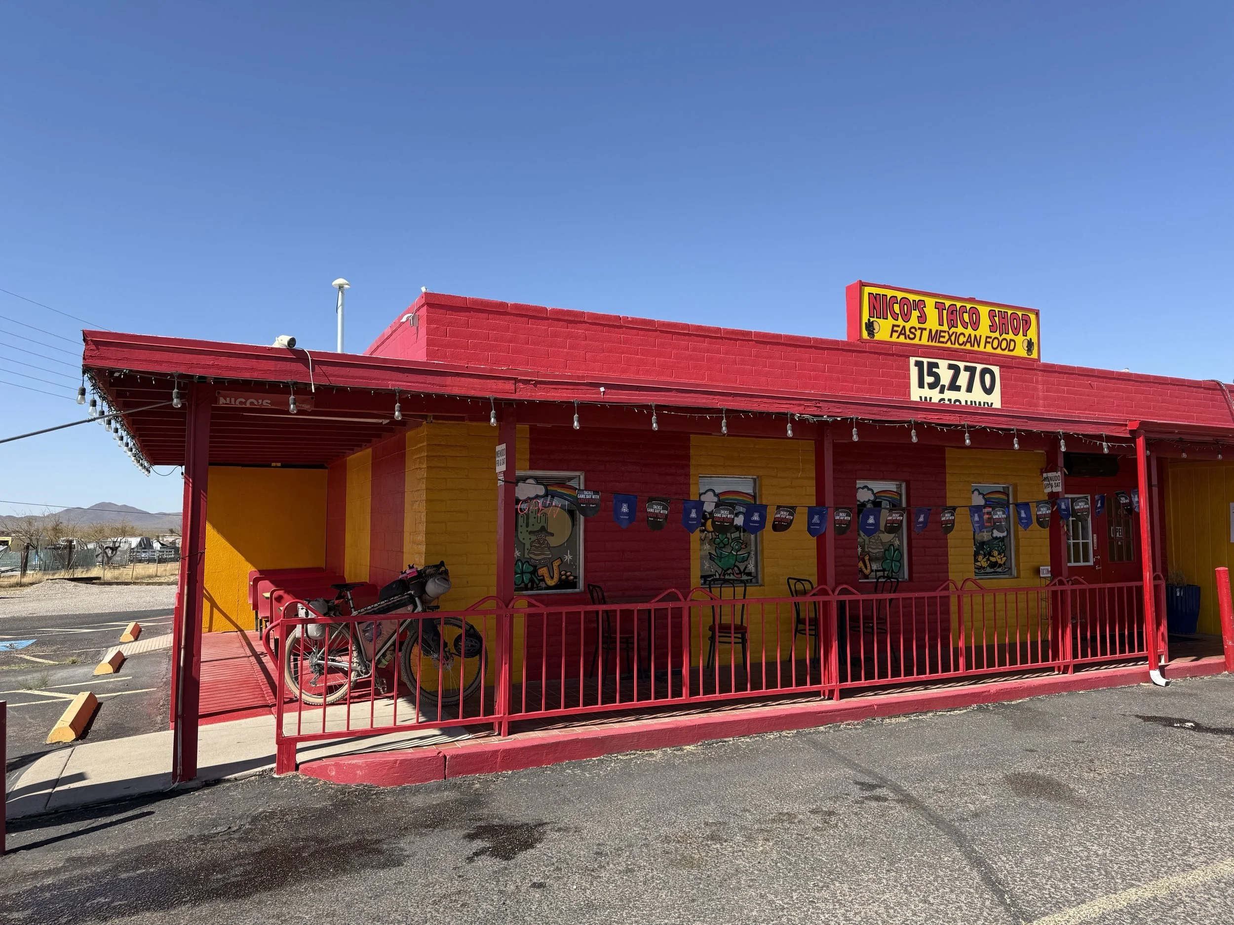The road was still wide and dirt - all seemingly downhill to Avra Valley below. The SAUER jumped off the main road to meander along back dirt track that looked like someone had turned it into their own abandoned junk heap. Josh laughed telling me how he did a tour through here one time with Sarah, his partner, and the refuse then was the same as it was now. And suddenly, we were at the bottom with the busy streak of the Ajo Highway in front of us. Three Points was just in view so we took the shoulder, crossed, and then made our way over to Nico's Taco Shop. I was cooked both from exertion and the heat that was well into the upper 90s.