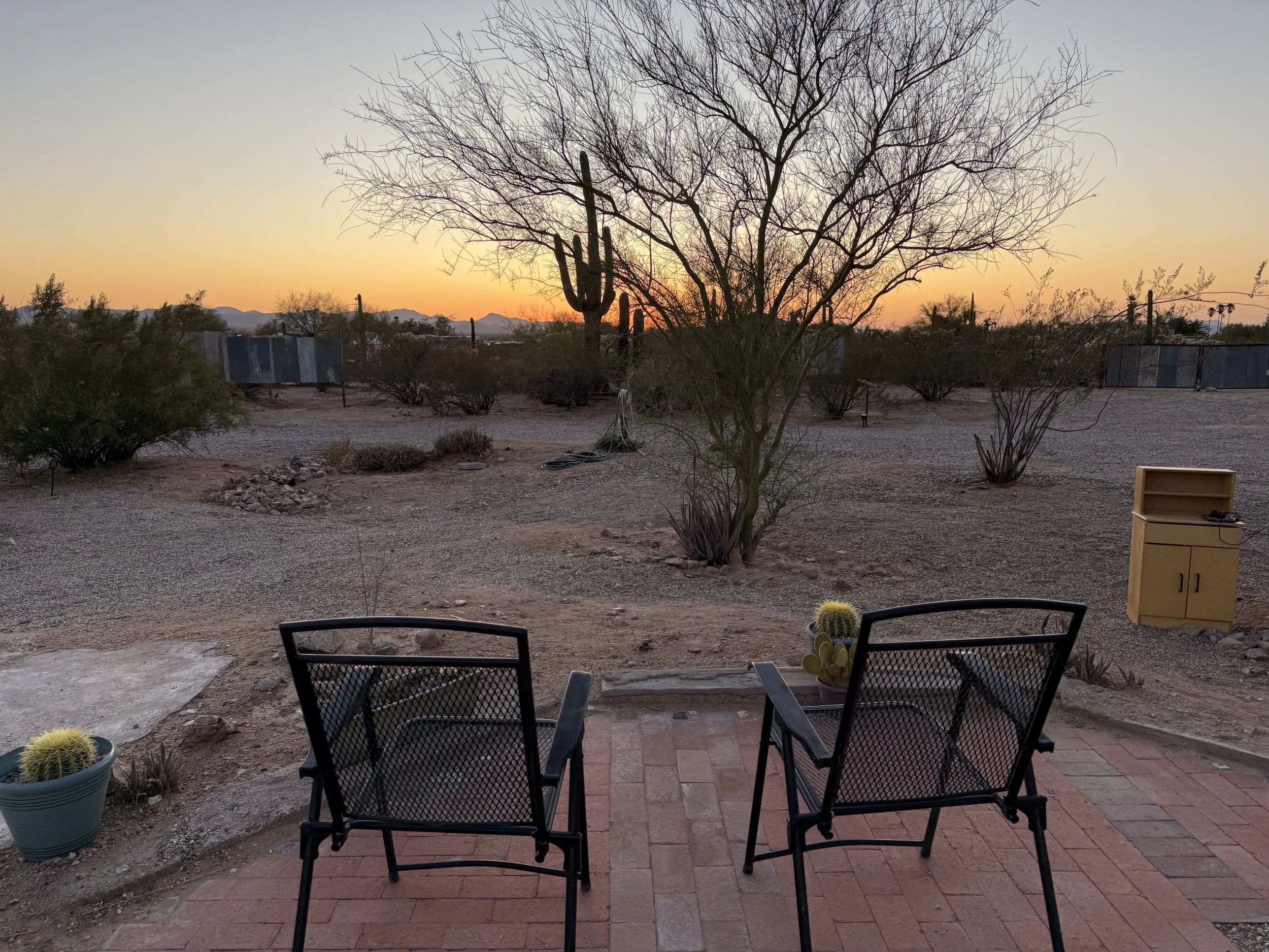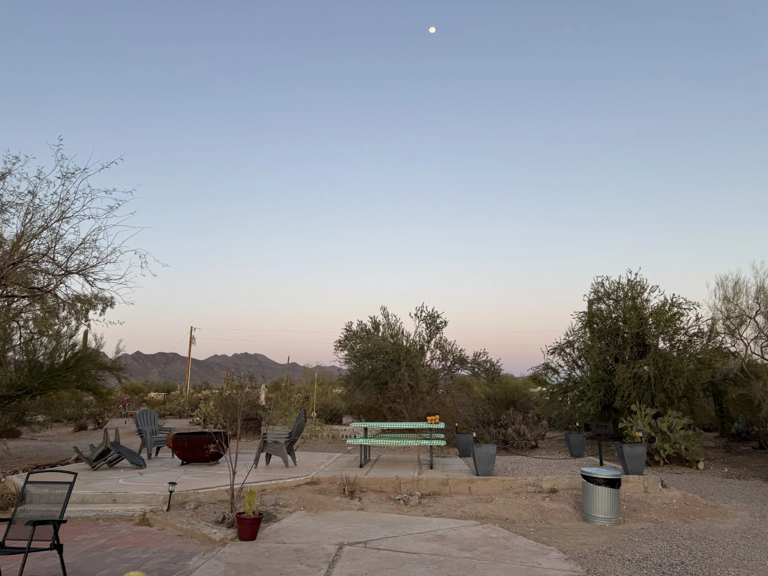 I headed north in the afternoon sun along the shoulder of pavement coursing parallel to Saguaro National Park - West. My destination popped up shortly thereafter: Camp Saguaro. It was a small private campground located just outside the National Park. I pulled in and was taken aback by how perfect it was for bikepackers: hot outdoor showers, chairs in a common picnic area, and a huge set of outdoor charging ports perfect for my lights and other electronics. I got to work grabbing a site and setting up under early evening. I didn't skimp on the shower which washed off days worth of salt and grime and relaxed my muscles. I then headed out to some chairs to watch the sunset with all intentions of starting to cook a dinner shortly thereafter.
